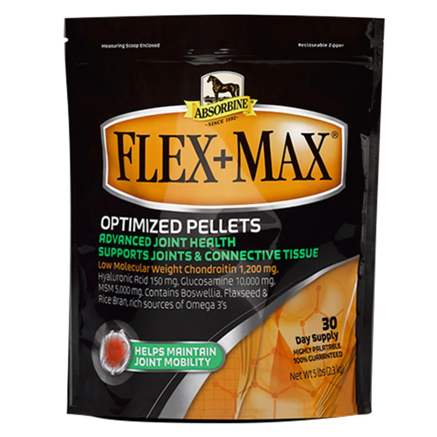 Absorbine Flex+Max is a pelleted supplement designed to support joint and connective tissue health. Flex+Max helps maintain joint mobility and strong bones to support overall well-being during normal daily exercise and activity. Pelleted.