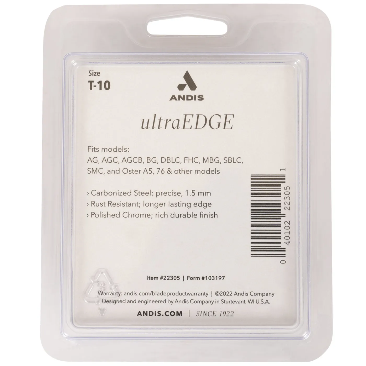 Andis® UltraEdge™ Clipper blades are made from high-carbon steel and processed through a unique carburizing heat treatment that adds carbon to the existing metal producing a harder cutting surface. UltraEdge blades hold a razor sharp edge that will endure prolonged use and more sharpening treatments. Expertly designed, these ultra-sharp steel blades slide through hair without snagging or catching. Ideal for all-over grooming, these blades easily detach for cleaning. This blade offers a 1.5 mm blade cut. Each blade is sharpened to exact quality standards and is hand tested before it is shipped. Made from carbonized steel with a polished chrome finish that is resistant to rust. Compatible with Andis series clippers AG, AGC, BG, DBLC, FHC, MBG, SMC, Oster A5 & 76 clippers, and some other models. Package measures 4.6″/12 cm L x 3.7″/9 cm W x 0.74″/2 cm D, weighs 0.2lb./91 g. Made in the USA.