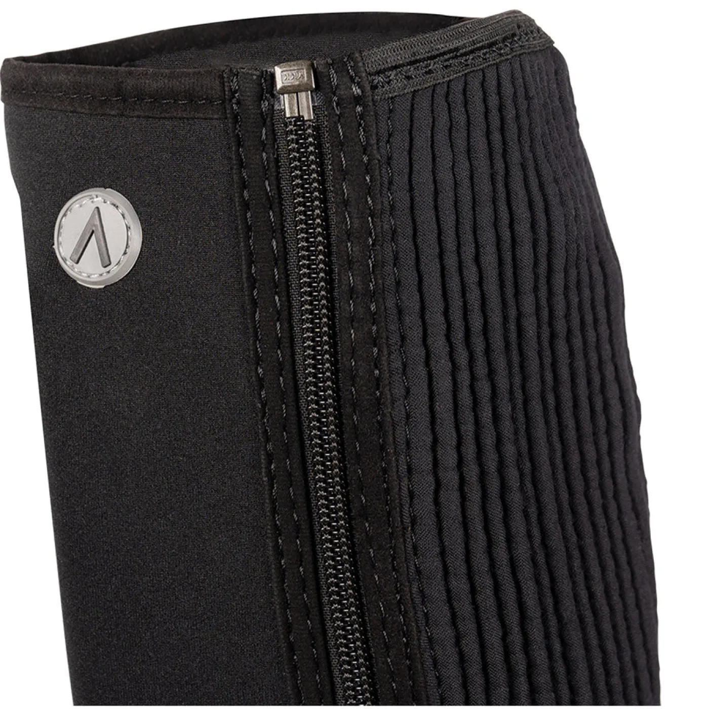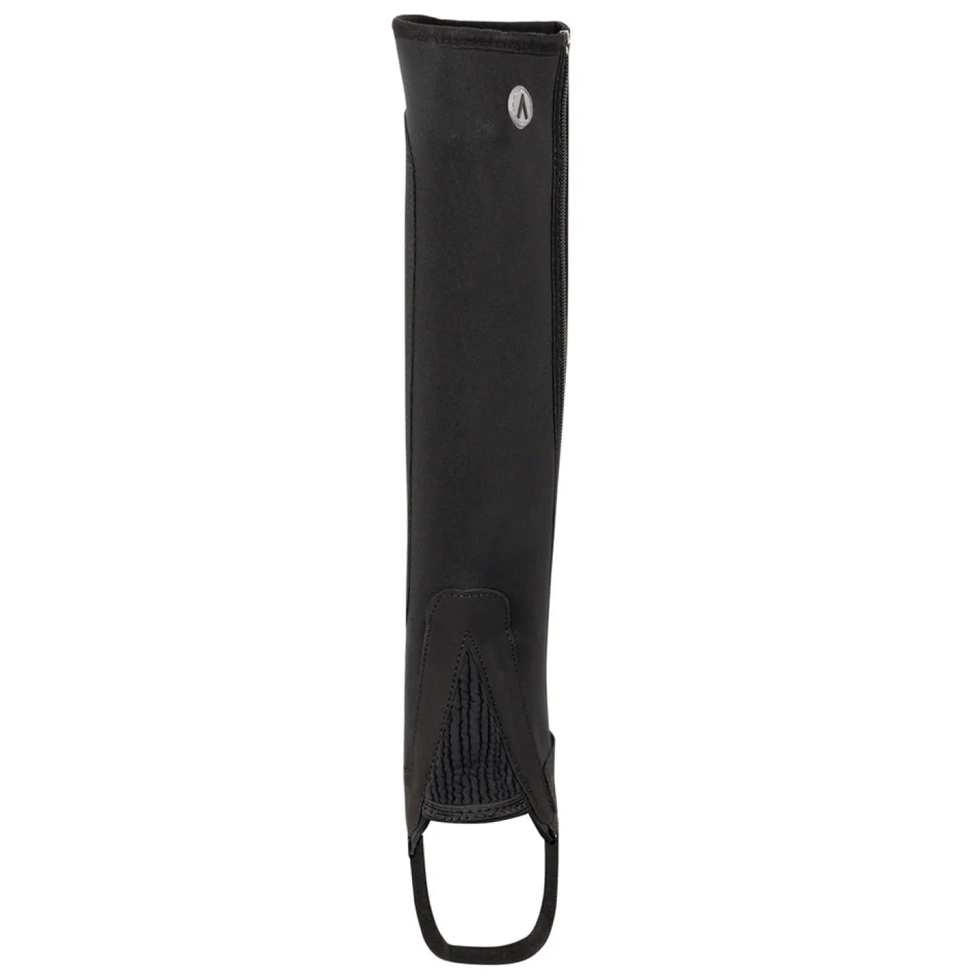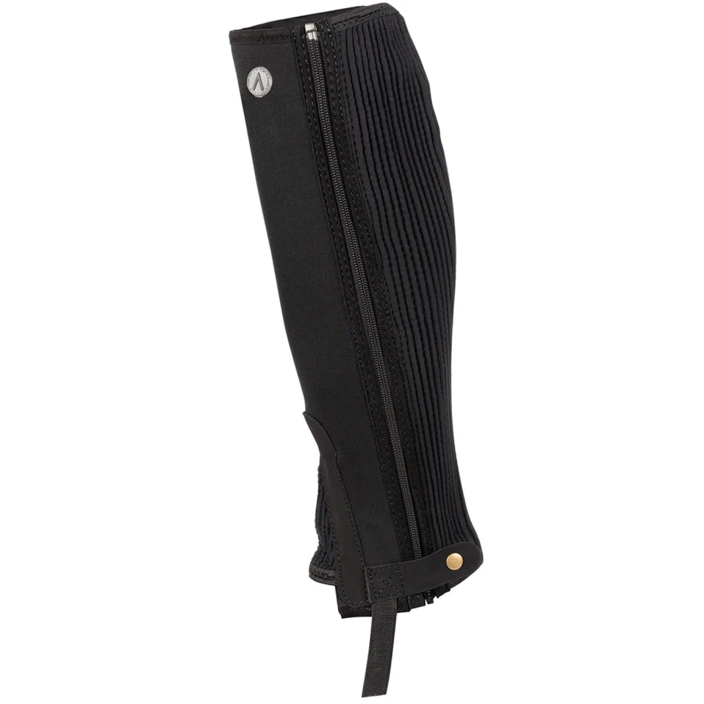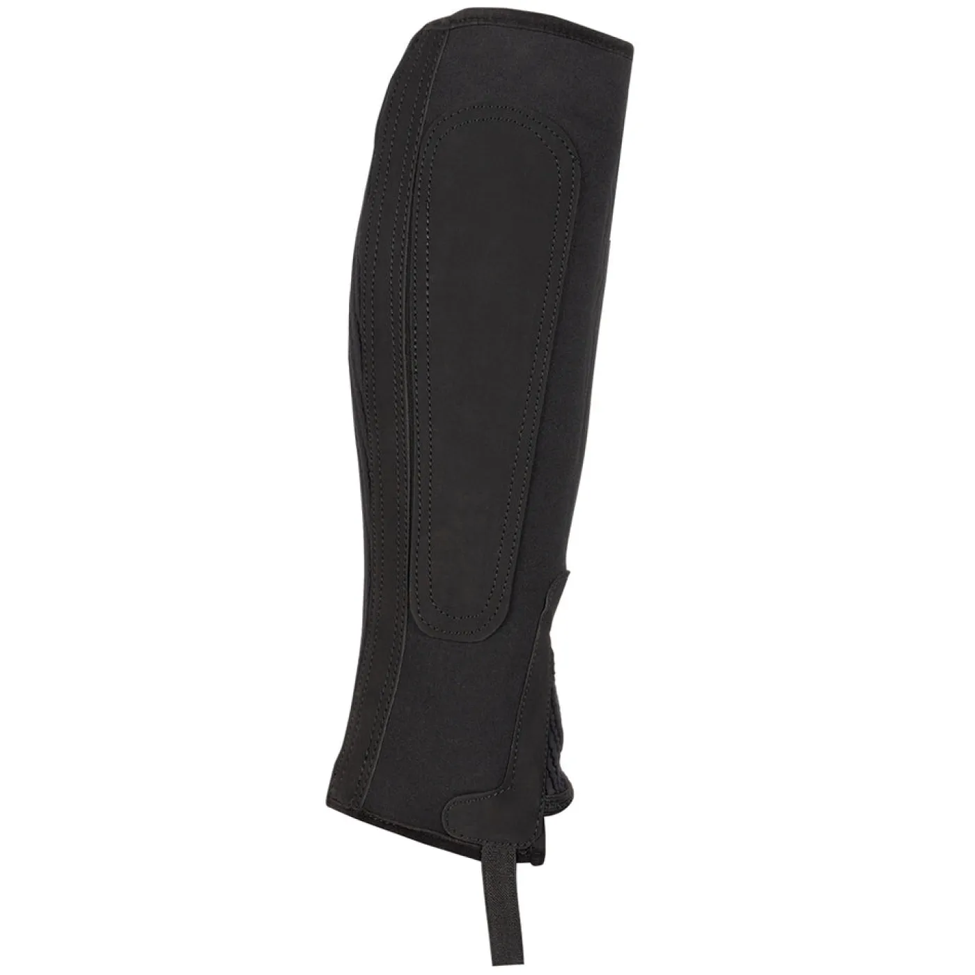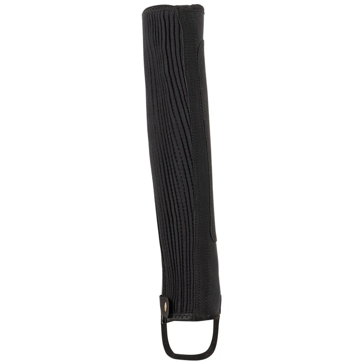 Traditional black half chap with neoprene construction allows for optimal comfort in the saddle. Soft stretch materials contour to the curve of your leg for superior fit. Stress point reinforcements and a padded inner calf enhance durability and grip. Complete with a side zipper and snap.