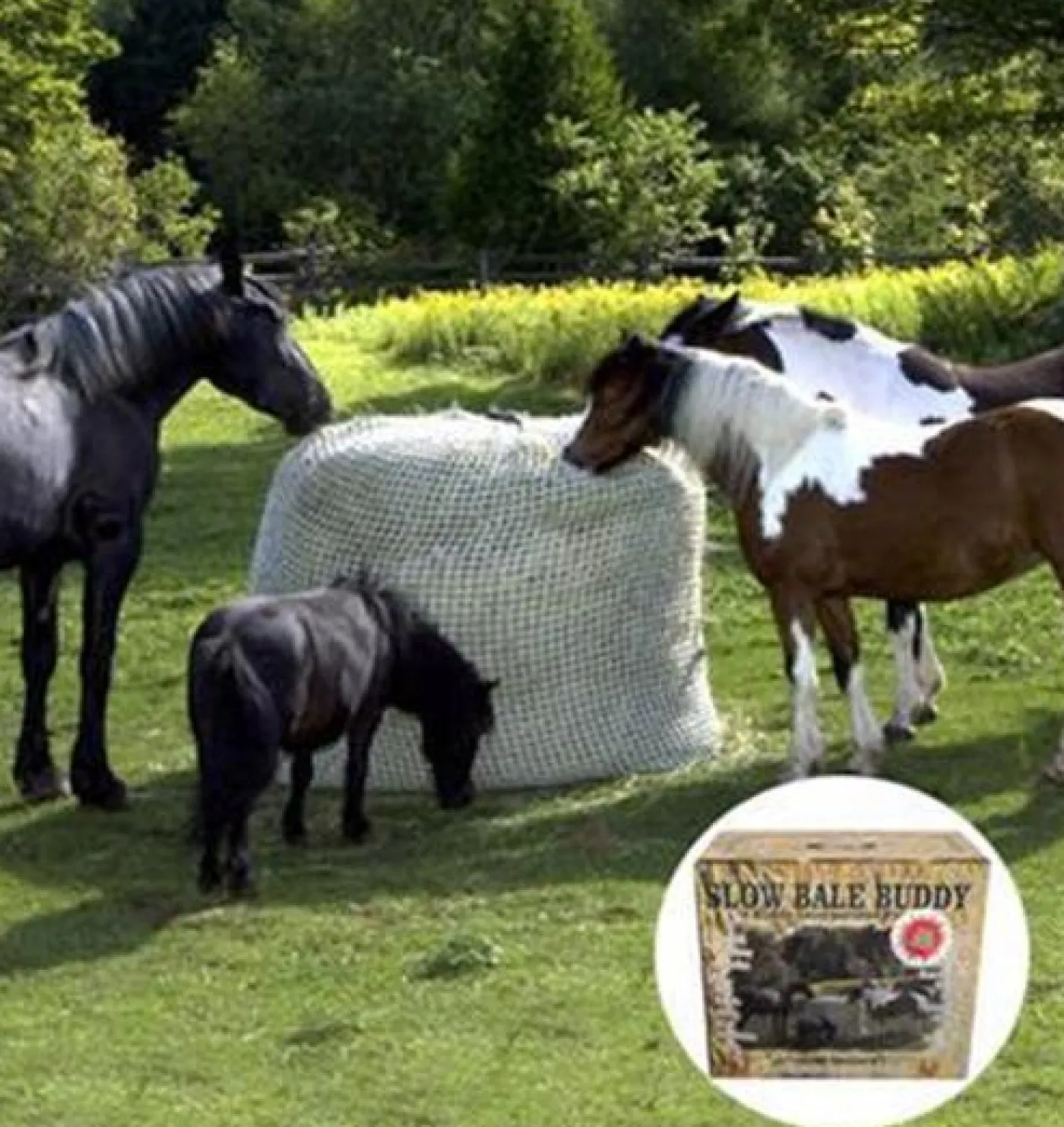 The perfect solution for feeding horses round and square bales of all sizes! Made of soft, strong knotless nylon netting with 1 ½ inch openings and fastened with a special safety fastener, it completely encloses the bale so that the horses must pull the hay through the holes in the netting to eat. Aggressive and anxious horses are calmed by having to graze and forage for their hay while overweight horses will walk away from the hay without overeating, helping to normalize weight. Slow feeding benefits most horses and is safe to use as the holes are too small for horses to get caught in.