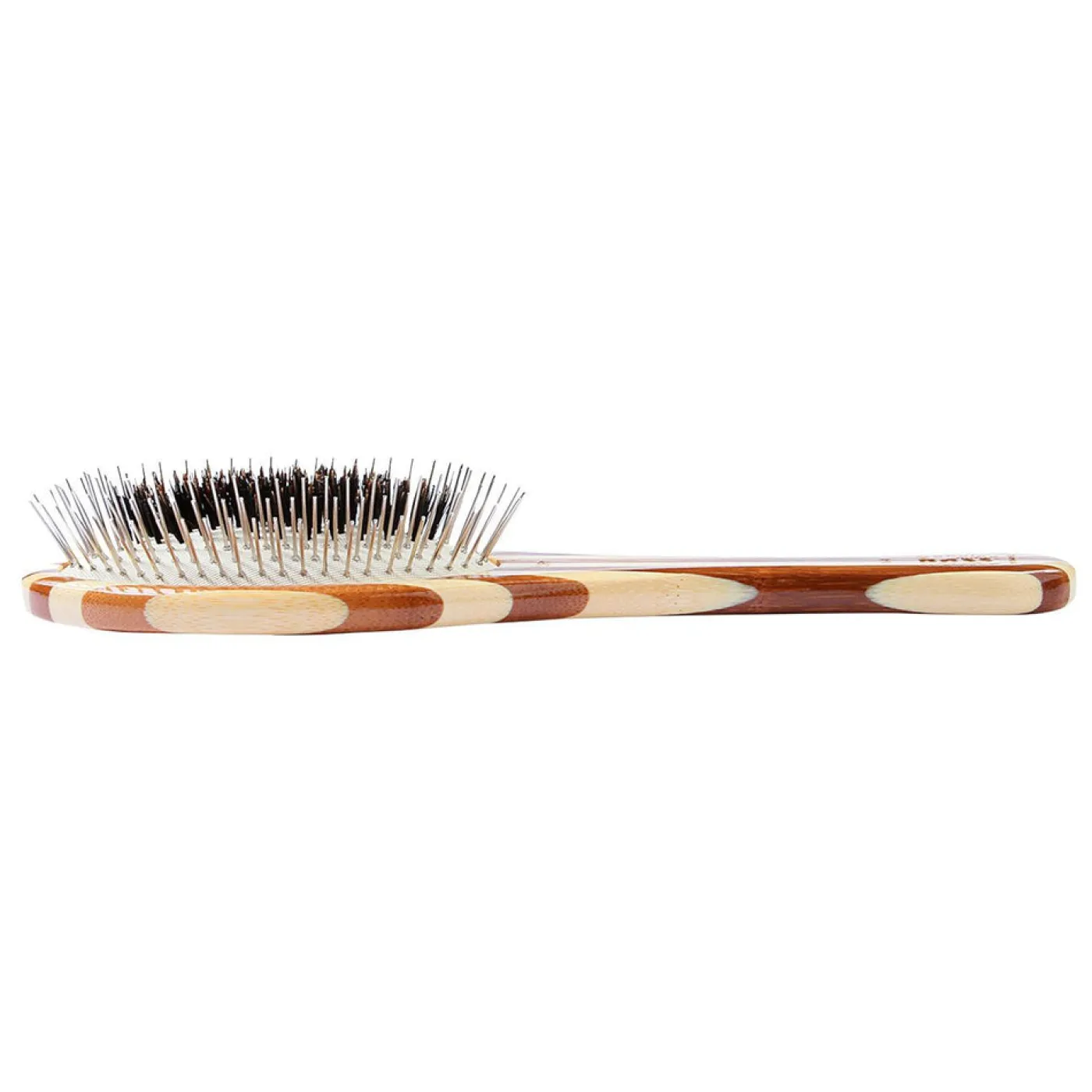 For nearly 40 years, Bass has designed luxury grade brushes with an emphasis on natural and durable materials for long product life and environmental sustainability. Bass brushes are used and endorsed by professional stylists, barbers and estheticians all over the world. Natural bristles create incredible shine by distributing oils, but don’t penetrate beyond the top layer of the coat. Alloy pins thoroughly detangle, but don’t create shine. With patented NEW Hybrid technology, you can FINALLY detangle and shine at the same time! The Hybrid Groomer is designed to combine the polishing power of natural bristles PLUS alloy pins to separate the fur – all on the same brush pad! It’s 2 brushes in 1, giving your pet’s coat a clean finish and healthy shine. The Hybrid Groomer has a beautiful eco-friendly bamboo handle, luxury grade finish, AND it’s AFFORDABLE for any budget!