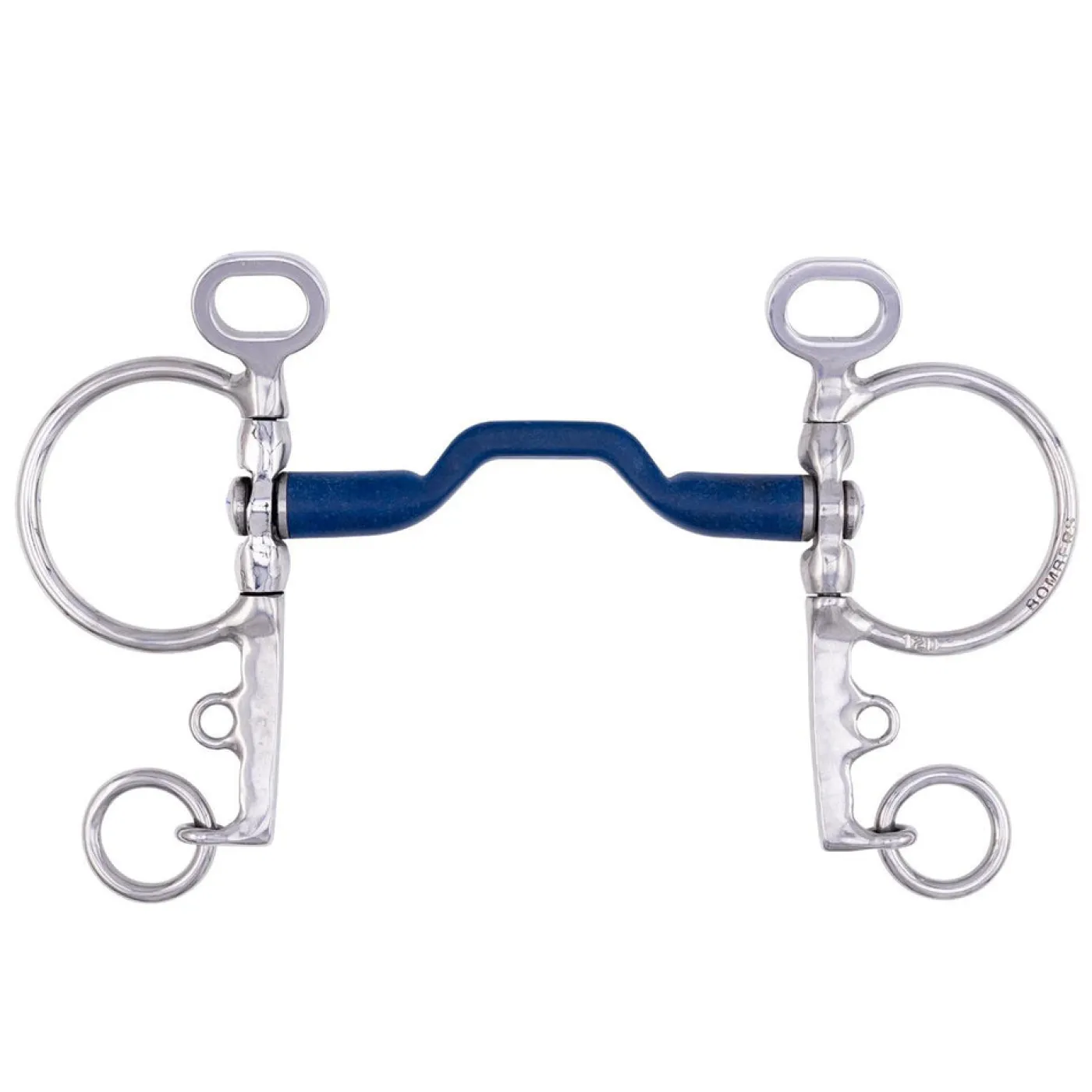 Great for horses that may object to metal mouthpieces! The Bomber Blue is a unique bit that helps horses perform at their best with a ported mouthpiece for tongue relief. The swivel mouthpiece can rotate on the horizontal, allowing the cheek piece to move independently and for horse to set the mouthpiece where it’s most comfortable. Bombers Pelham 55 has attachments for two reins; one near the mouthpiece and one at the end of the shank. The pelham’s shank exerts moderate poll pressure and leverage on the mouthpiece and curb while the traditional cheekpiece with curb chain introduces poll, tongue, and curb pressure.