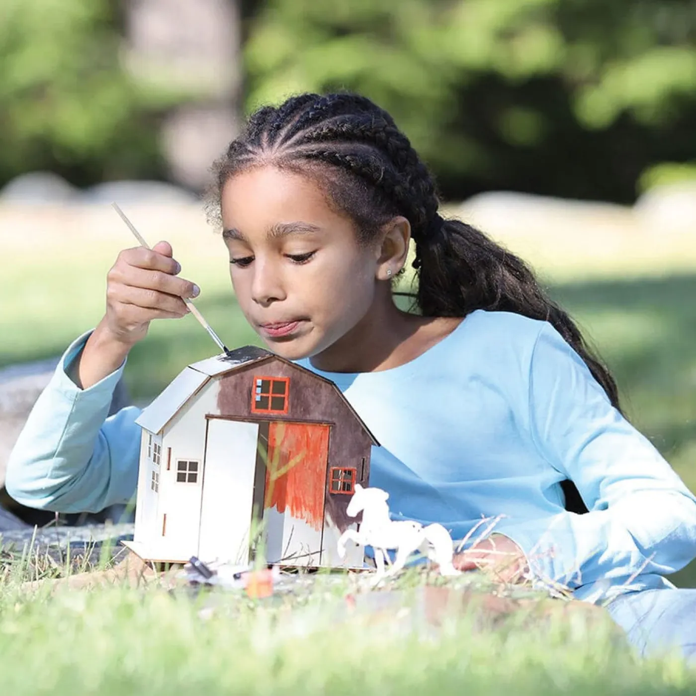 Build, paint, and play! This fun, new playset features an easy-to-build, 11-piece wood barn that requires no tools or glue! Just slide the tabs into the slots and you’ve got yourself a barn. Grab the included paints and paintbrush and finish your barn in your own, personal style. Plus there’s a ready-to-paint Stablemates horse to give you the complete playset experience!
