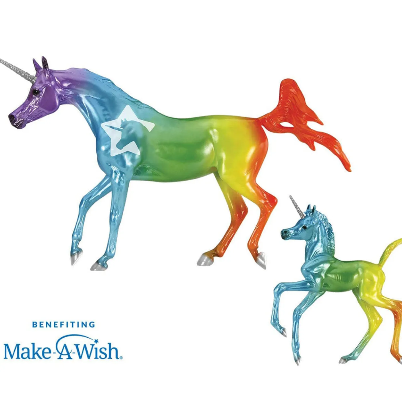Breyer’s mission of Hope continues with the introduction of Love, the brightly coloured unicorn mare, and her equally brilliant unicorn foal, Hope. Together they represent the heartfelt love a mother has for her child and visions of hope for a beautiful life. $5 of every limited-edition Love & Hope model purchased will be donated to Make-A-Wish, a nonprofit organization whose mission is to create life-changing wishes for children with critical illnesses. When a wish is granted, a child replaces fear with confidence, sadness with joy, and anxiety with hope!