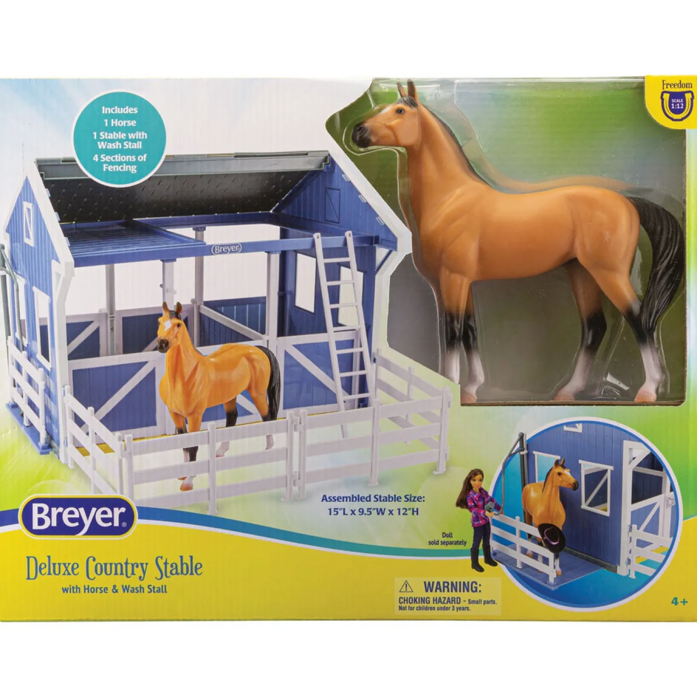 This Freedom Series stable is loaded with fun features, and you will love how easy this stable is to assemble – just snap it together! Featuring a built-in slide-out wash stall with swinging hose! Roof swings open on either side for additional access to stalls and loft, which has a moveable ladder. Two roomy stalls with doors that open and close. Four fencing sections create an attached paddock behind the barn, or can be used independently to create an enclosure. Stable features attached saddle racks and bridle hooks for tack storage. Freedom series, 1:12 scale. Ages 4+.