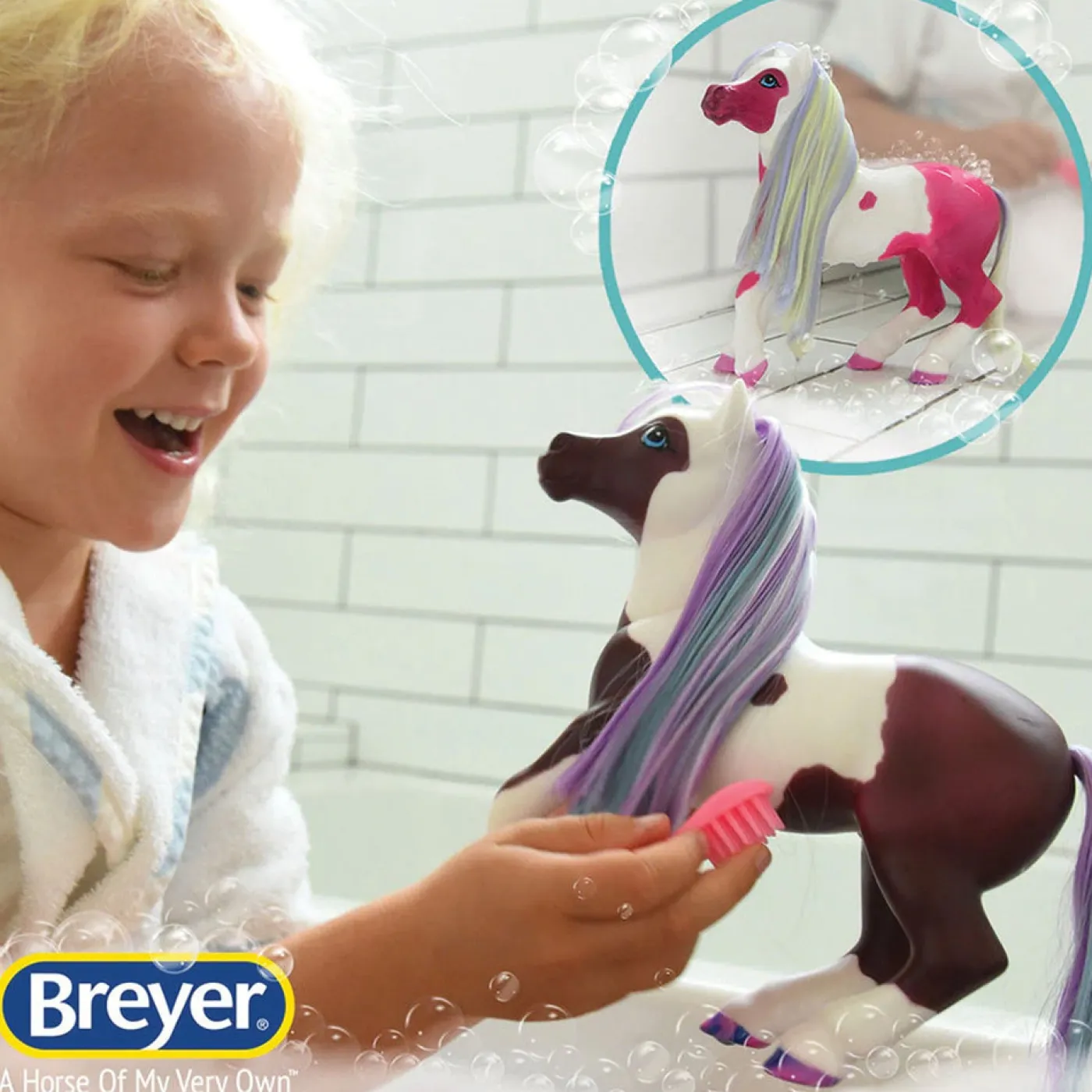While she loves playing with her friends on the land, this mer-pony princess is at home in the water. Dip her in warm water to see her markings, hooves, mane, and tail change colour! After her swim, dress her in the shimmery mermaid tail blanket, and finish off her look by brushing her hair and putting on her crown. Includes crown, atomizer bottle, hairbrush, and removable mermaid tail blanket.