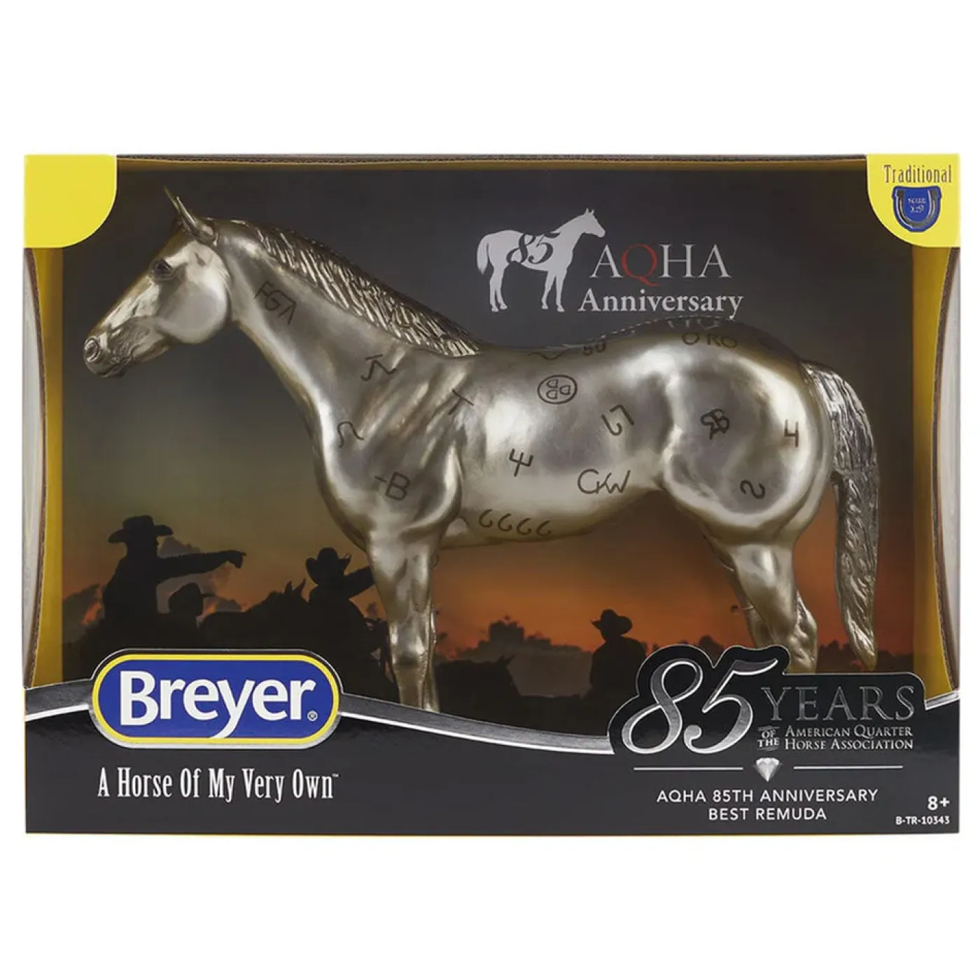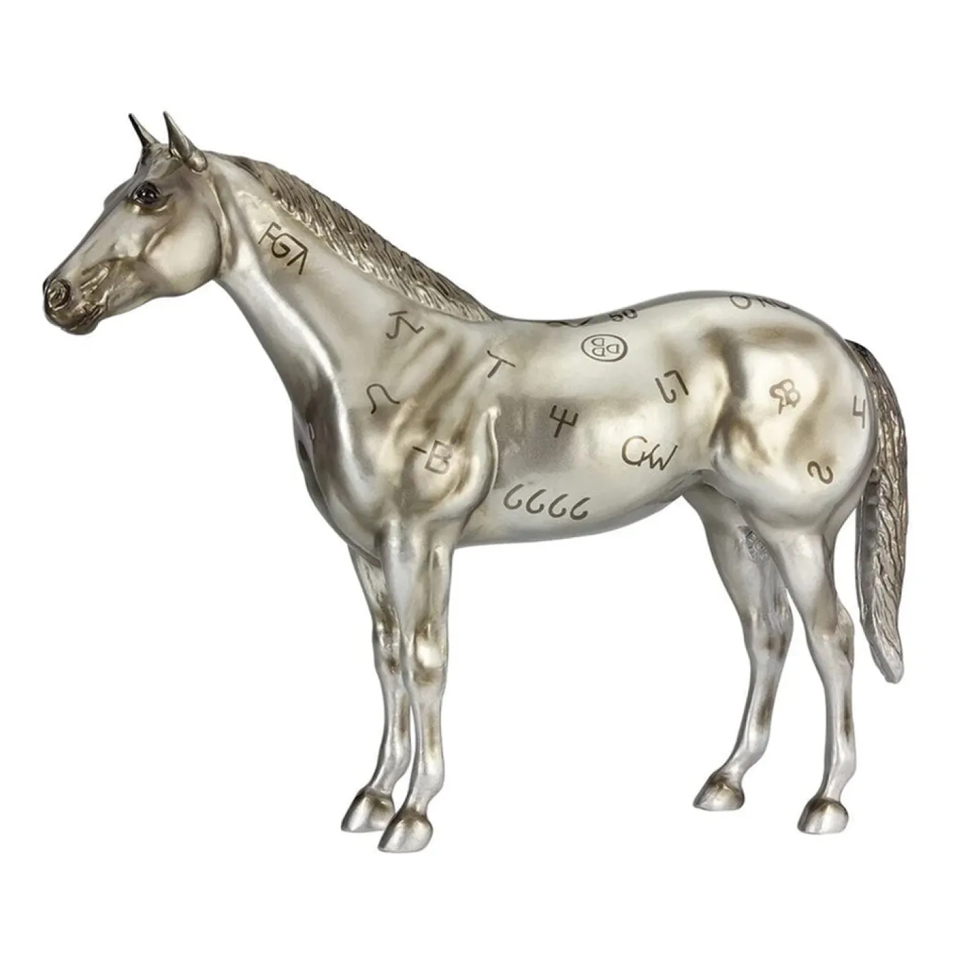 Celebrate the 85th anniversary of the American Quarter Horse Association with this special commemorative model! This special anniversary model was created on the Ideal American Quarter Horse sculpture, and features a unique metallic silver coloring that gives it a trophy-like appearance. The Best Remuda Award honors the ranches that bred quality horses that were athletic, versatile, sound and good-minded – the foundation stock of this highly popular breed. A tribute to the ranches and working horses that helped build the AQHA into the association it is today, each brand featured on the model’s coat represents an AQHA Best Remuda Award winner. This special-edition model has “AQHA 85th Anniversary” on its belly.