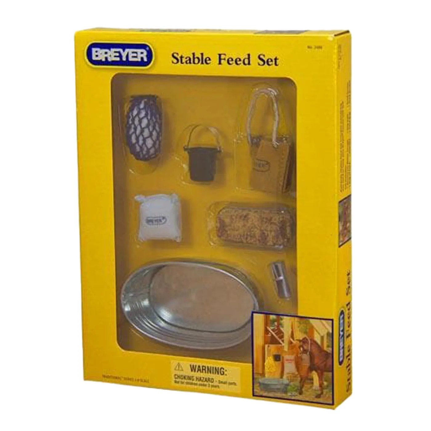 Keep your Breyer horses fed and watered with this finely-detailed boxed set! The Breyer Stable Feed Set includes an aluminum water trough, a hay bale and a hay net, a feed bucket, a feedbag, a bag of feed and a feed scoop. Horse and barn not included. Traditional size, 1:9 scale. Ages 8+