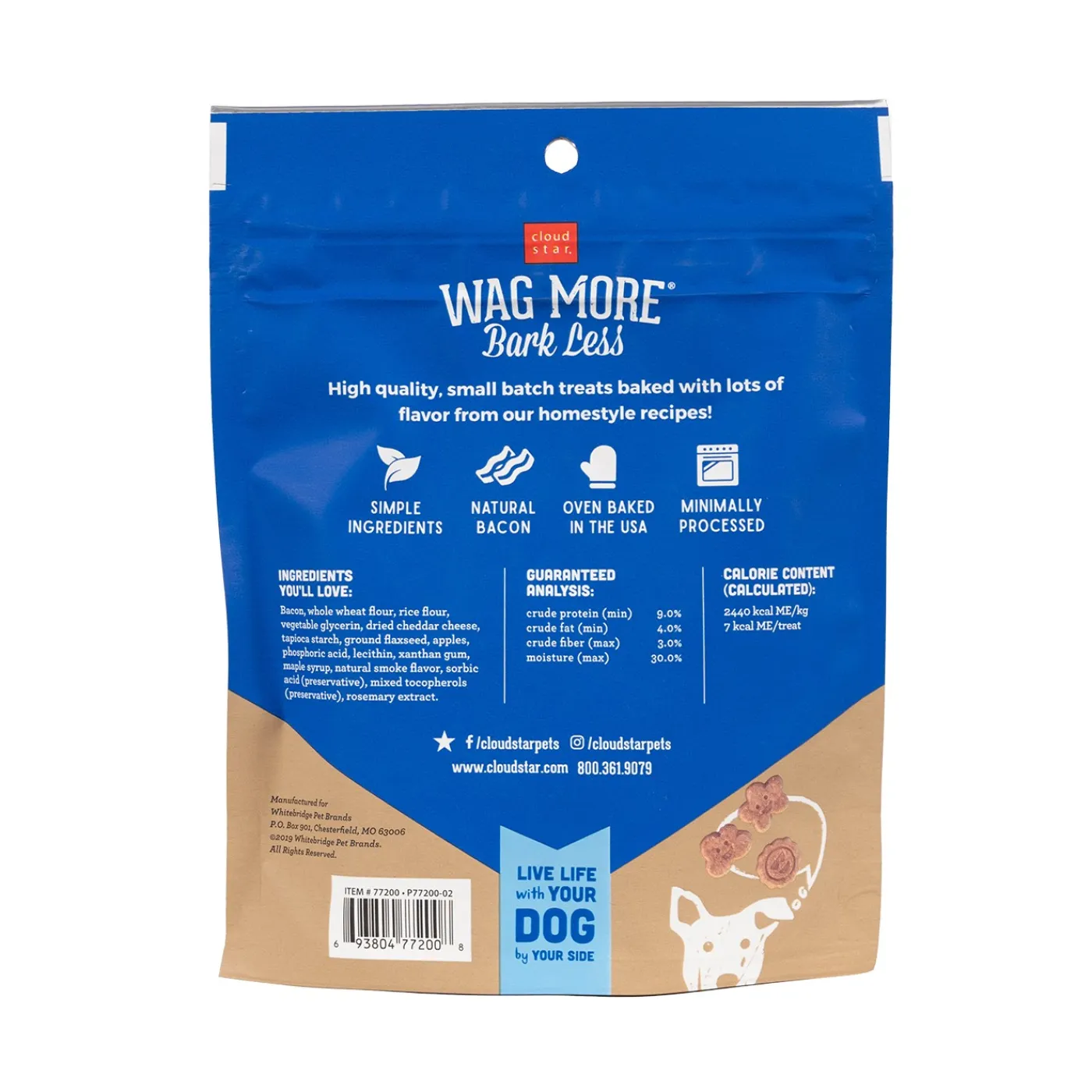 Cloud Star Wag More, Bark Less Soft & Chewy Dog Treats are perfect for on the go and feature adorable smiling star, sun and cloud shapes. Created with healthy whole grains without corn, soy, or white potatoes and does not contain artificial flavours or colours. A limited ingredient recipe with natural bacon, cheese and apples.