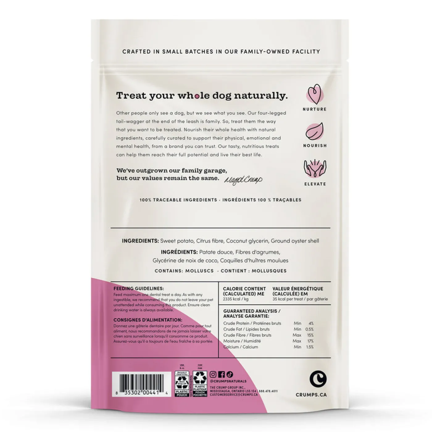 Crumps Plaque Buster dental sticks are a great way to make oral care fun for your dog! A delicious natural sweet potato flavour combined with finely-ground oyster shells to aid in the removal of plaque and tartar build-up on canine teeth. Newly reformulated to provide a less brittle, more flexible texture to ensure safe chewing – no sharp edges! Now with a new floral shape to boost the oral care benefit by better fitting around each tooth.