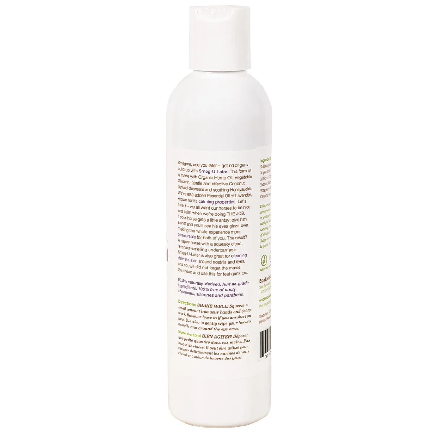 This natural formula is made with gentle yet effective coconut-derived cleansers and soothing Honeysuckle Extract to make sure our precious geldings and stud muffins don’t get irritated down there. We’ve added essential oil of Lavender known for its calming properties. Let’s face it, we all want our horses to be nice and calm when we’re doing THE JOB. Smeg-U-Later is also great for cleaning delicate skin around the eyes and nostrils, as well as for the teats of foaling mares. All natural, human grade, concentrated formula. Packaged in 100% recycled plastic.