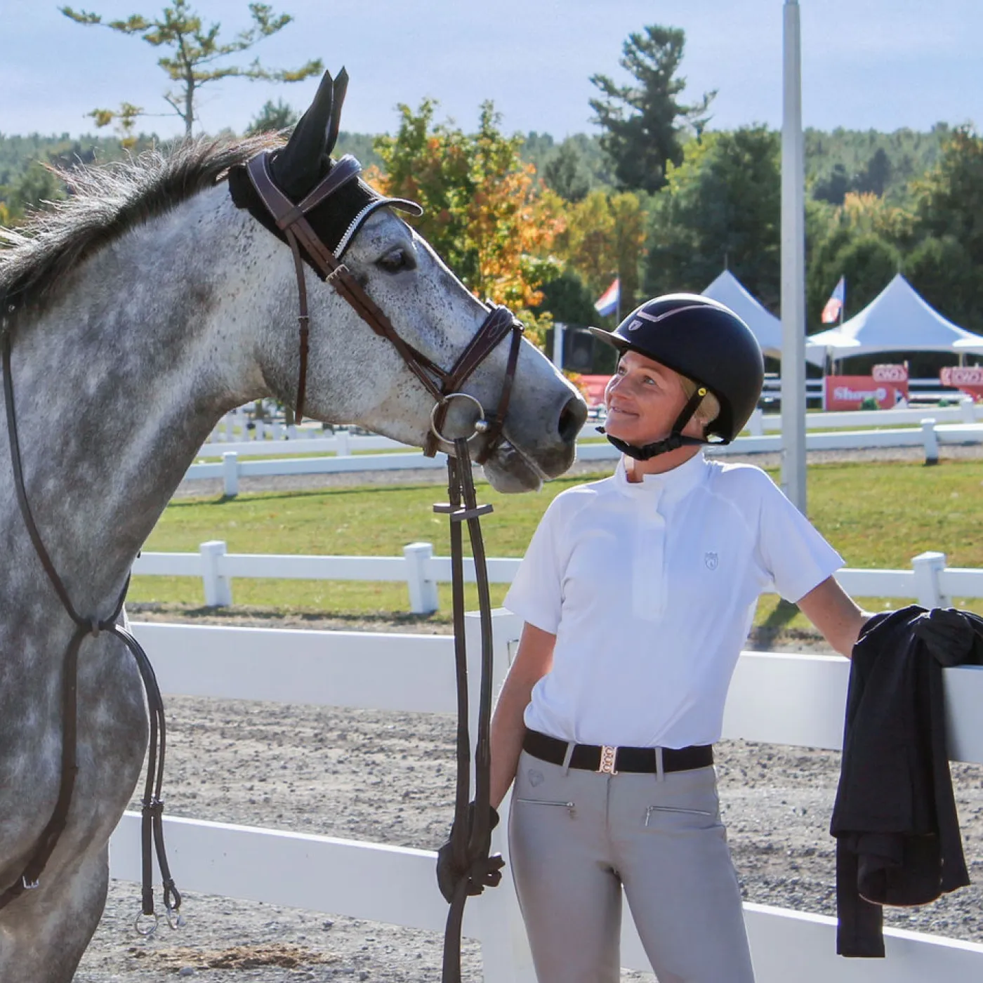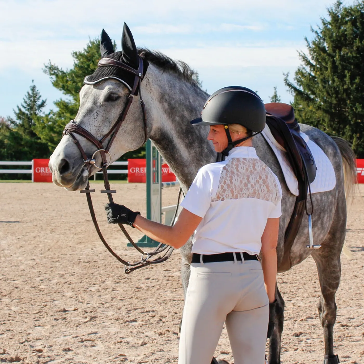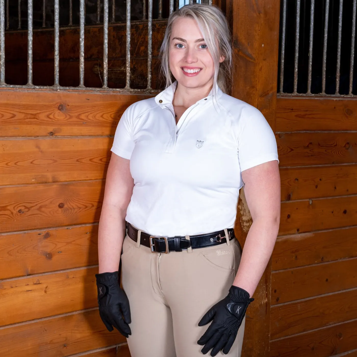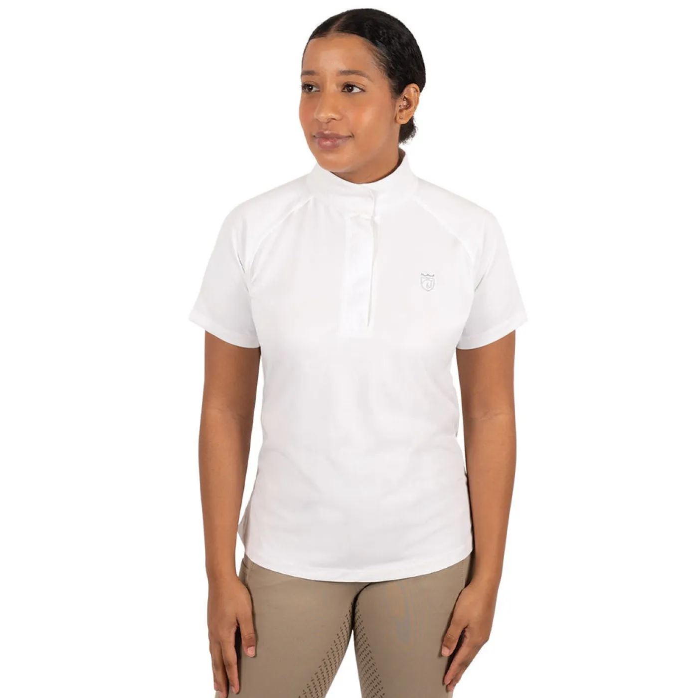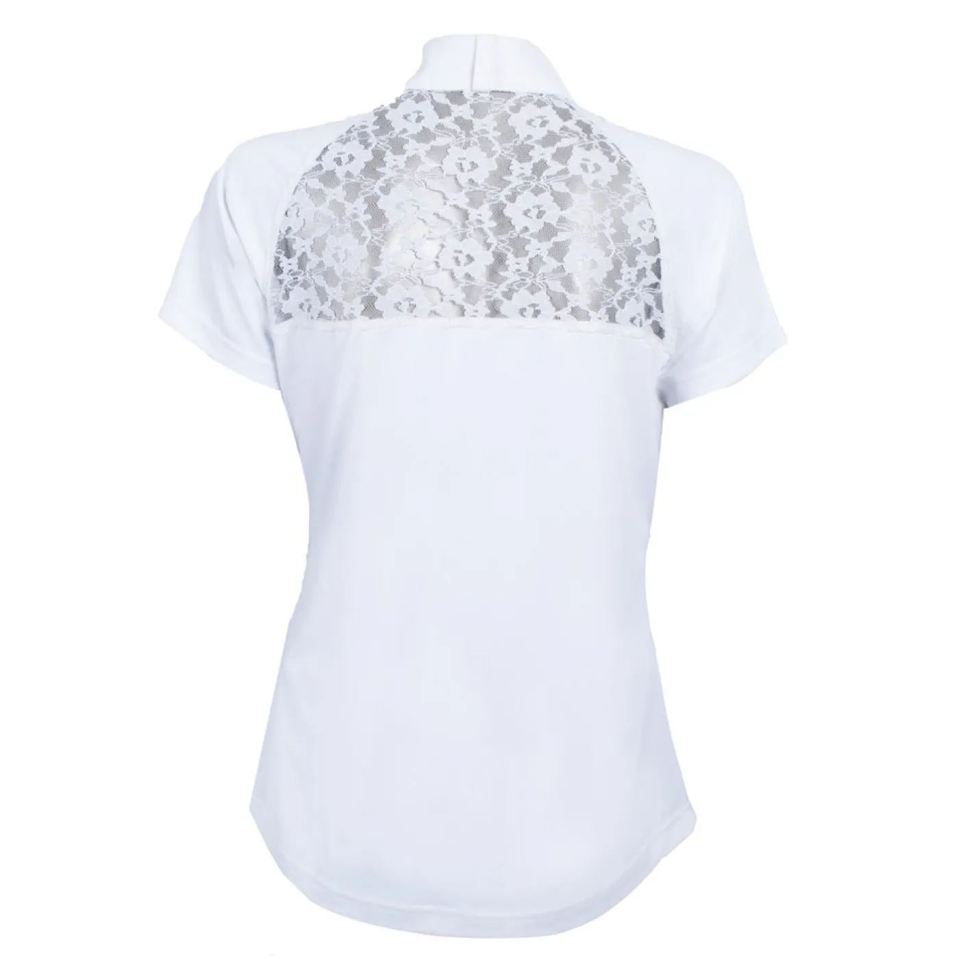 Exclusive to Greenhawk, this stylish short sleeve short shirt features a lace cut out detail in the back and a hidden zip closure in the front. Made from comfortable, stretchy fabric the provides UV protection, a great choice for your summer show shirt collection.