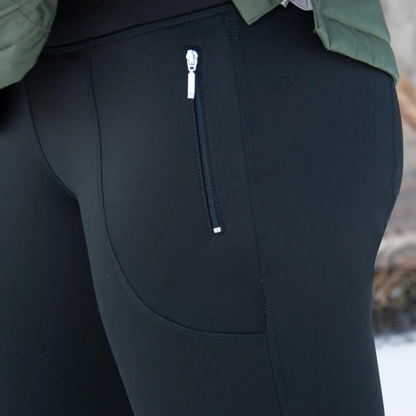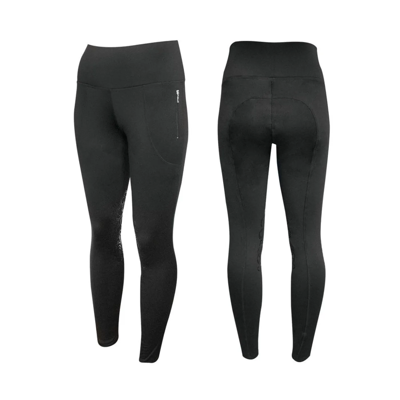 Stretchy and soft fleece-lined winter riding tight features a figure-flattering medium-rise thick waistband and a streamlined euro seat. Decorative and functional silicone knee-patches help enhance grip in the saddle. Two front zip pockets help keep hands warm and valuables close.