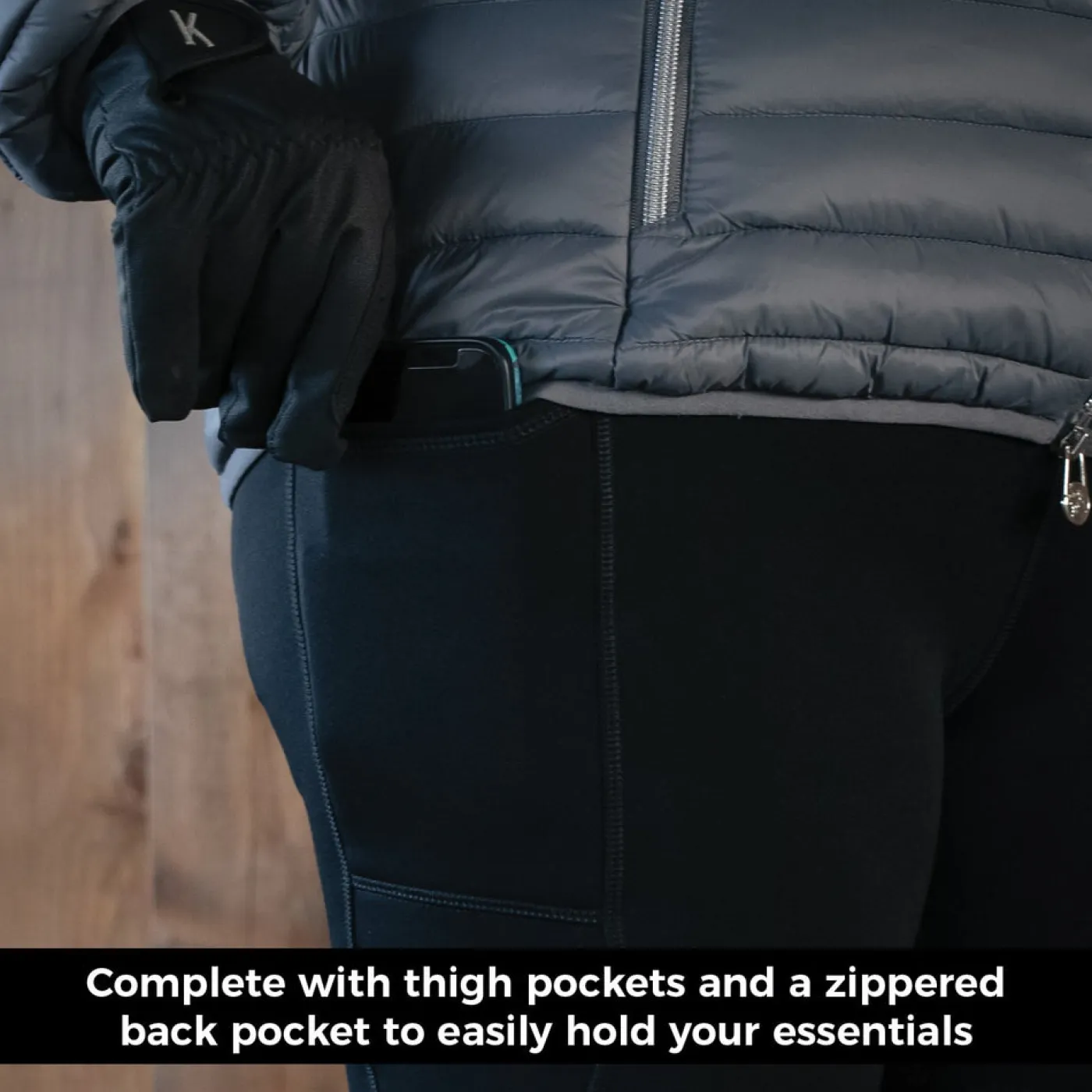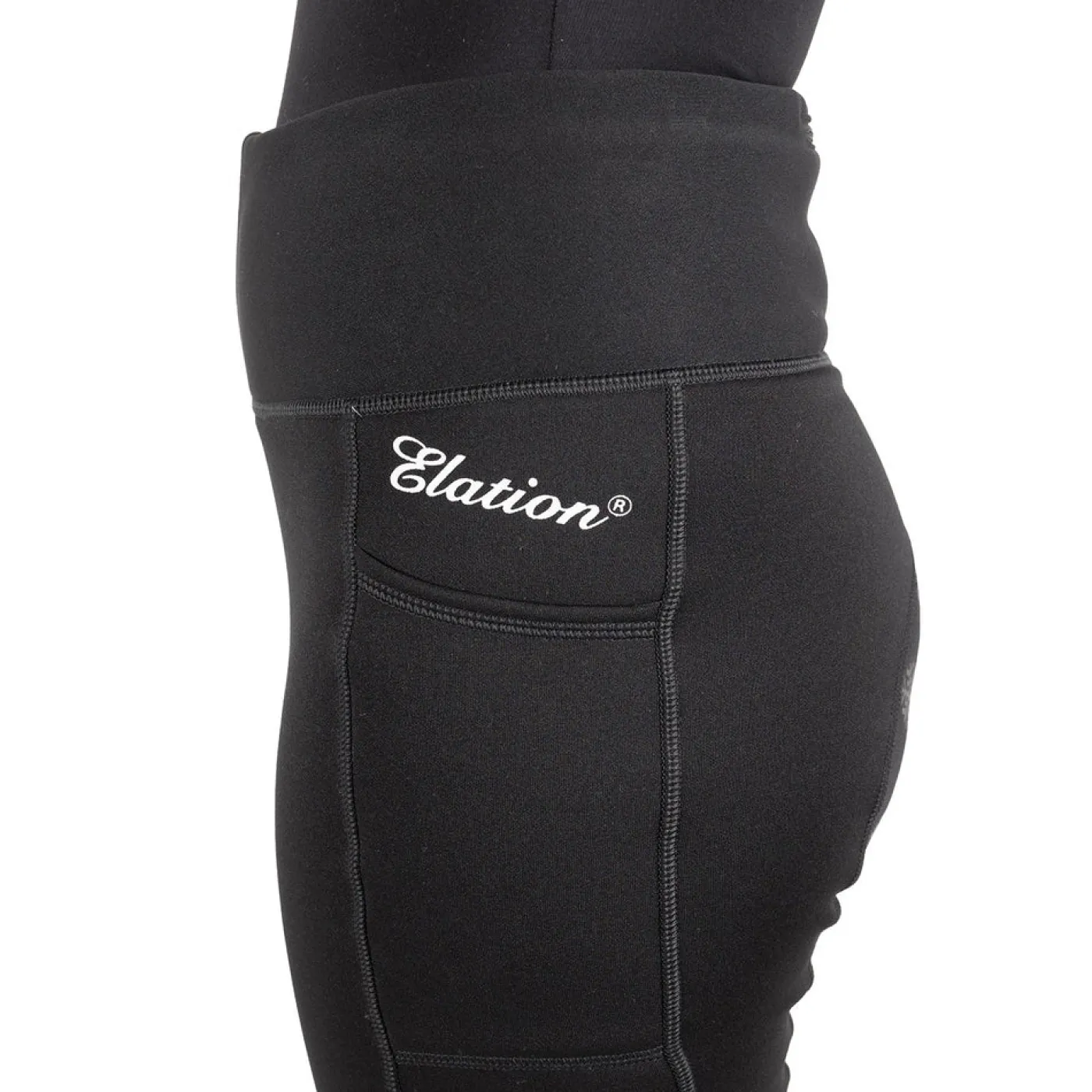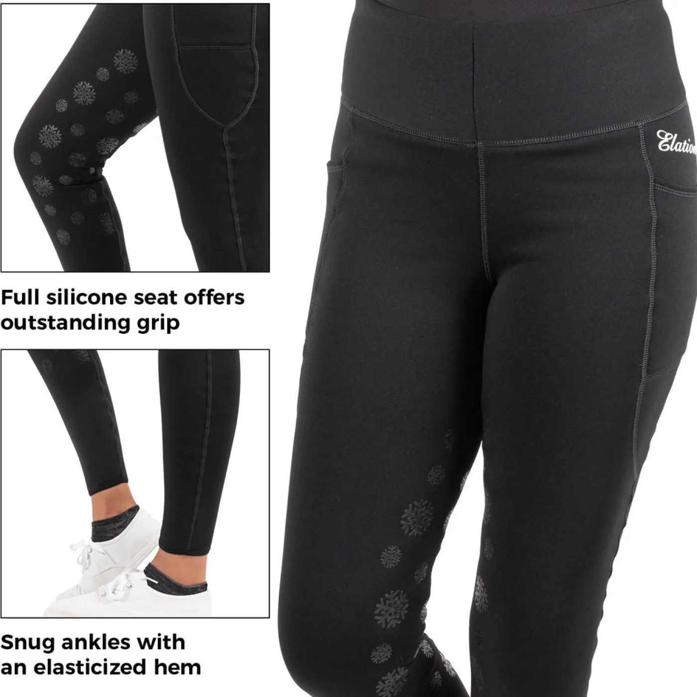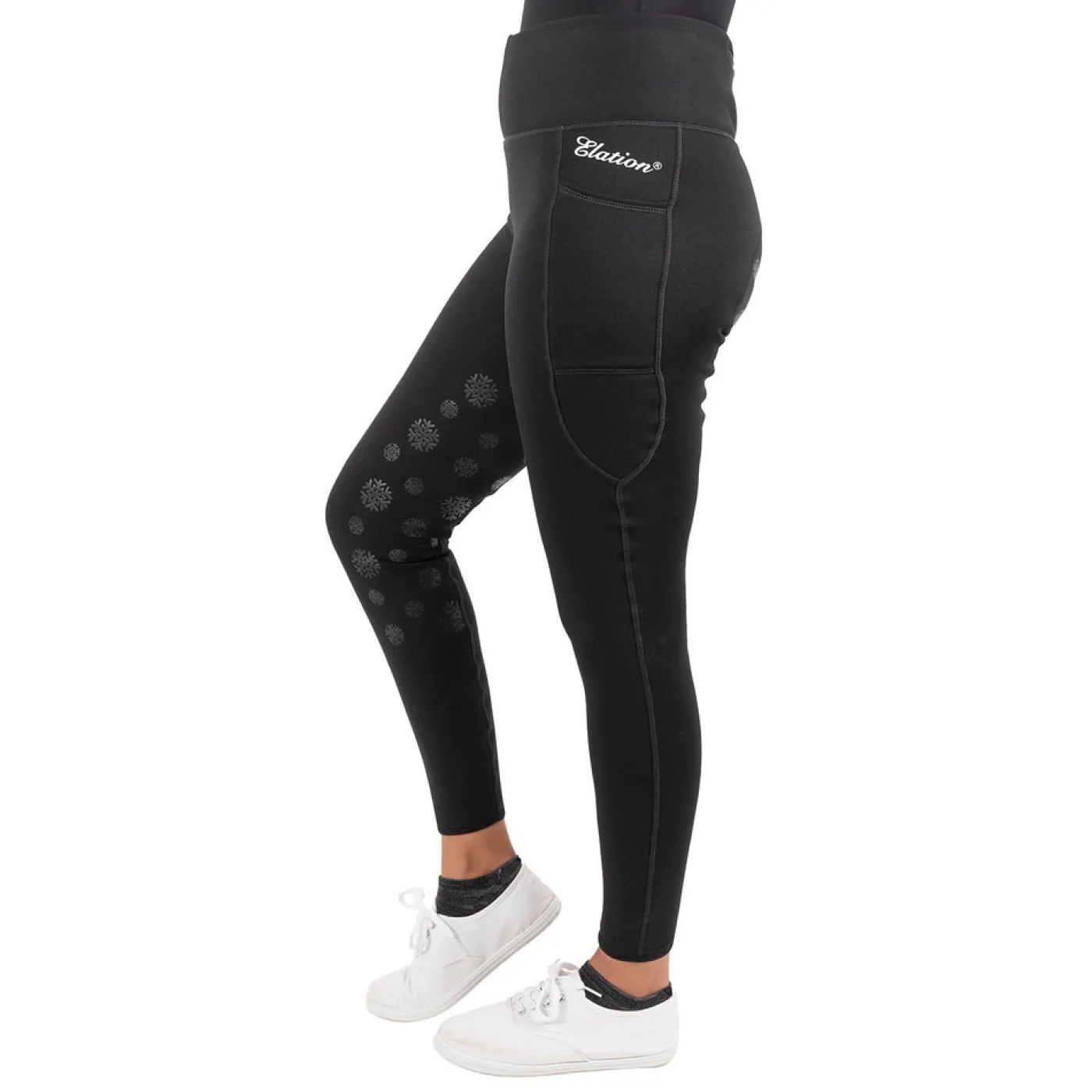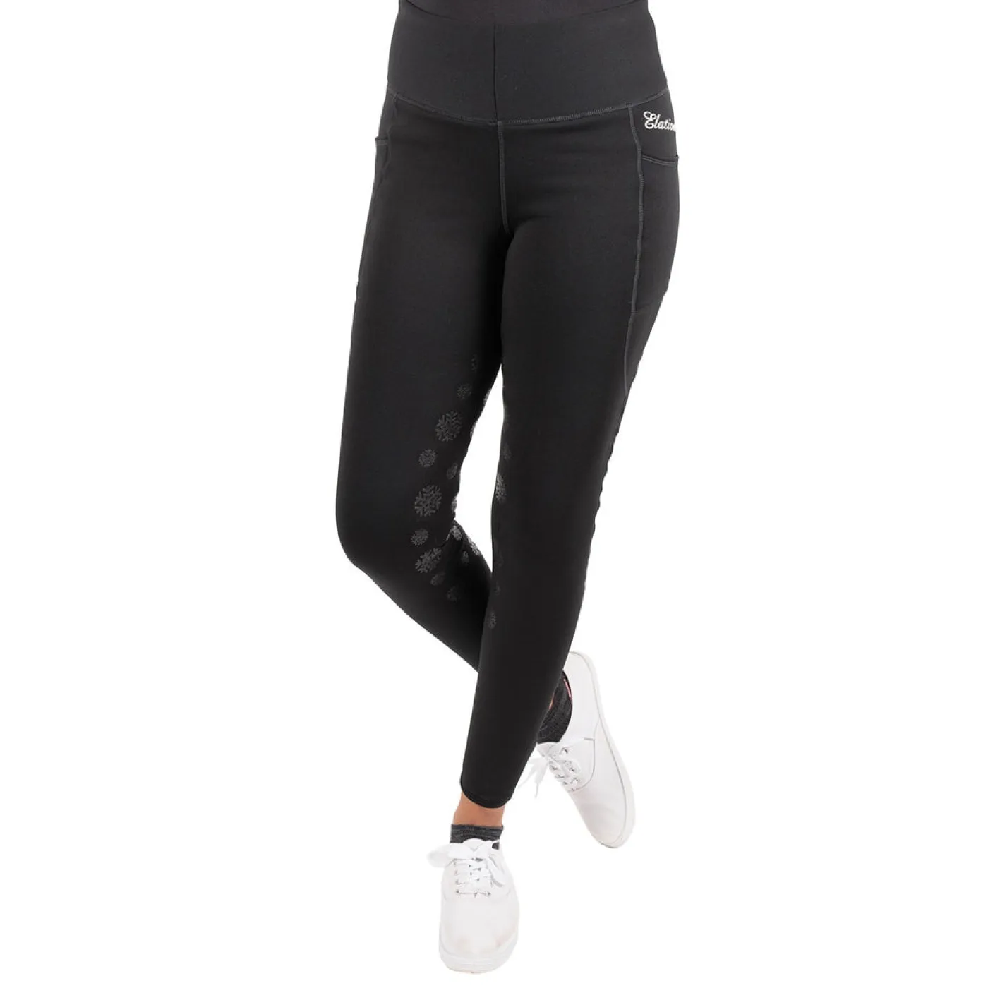 Stay cozy all winter long with the Elation Red Label Flurry Tight! These pull-on, fleece lined tights are designed to keep you extra warm in cold conditions. The plush fleece lining is incredibly soft on skin, while the flattering wide waistband includes a zippered rear pocket for treats or keys. Elasticated bottom hems stop these tights from riding up underneath your boots. Thigh pockets on both legs are large enough to fit your phone. Finished with a silicone full seat in a fun snowflake pattern to help keep you secure in the saddle.