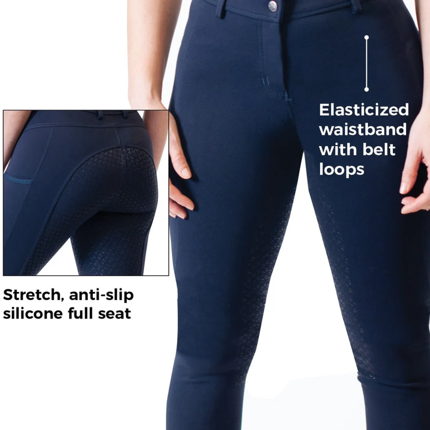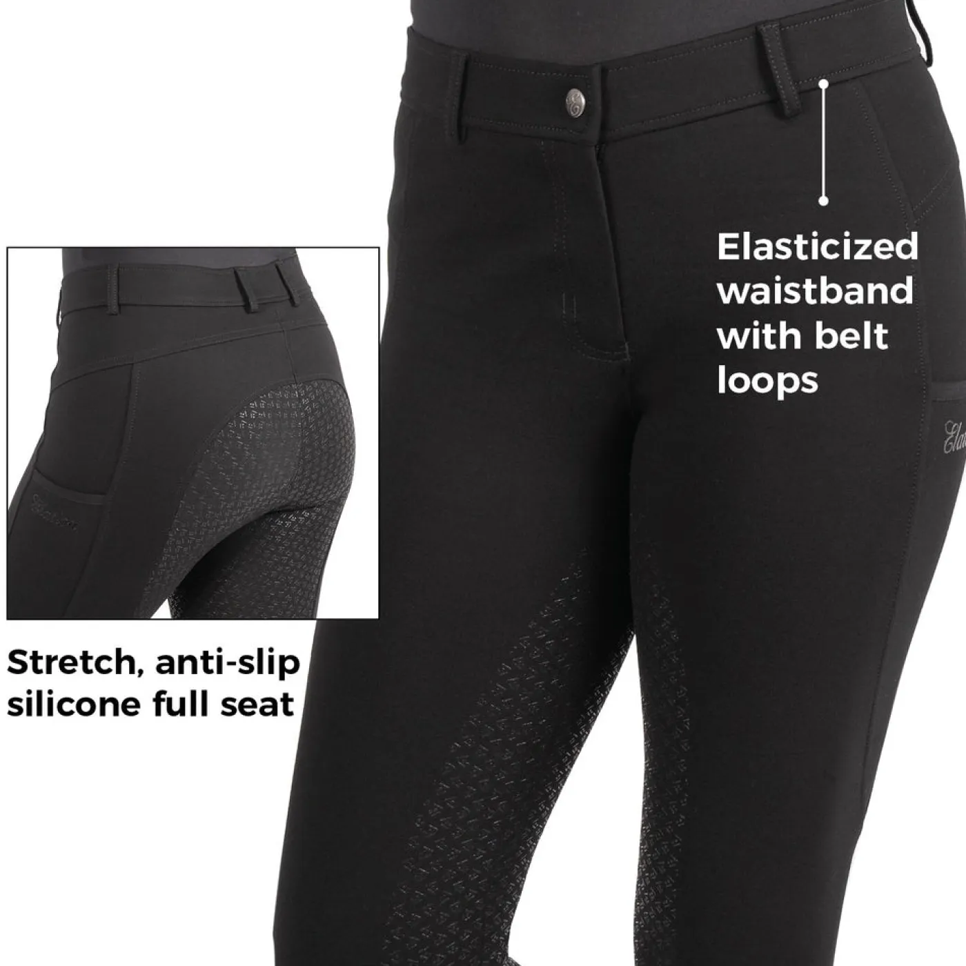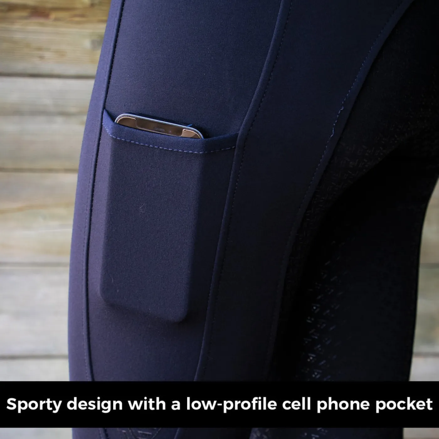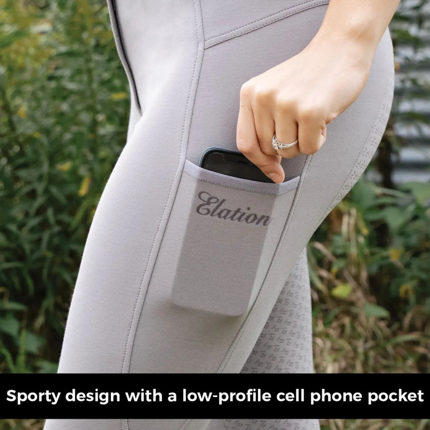 The Elation Red Label Sport Full Seat Breech is created in a performance stretch fabric and styled in a modern, sporty design for a flattering, comfortable fit. Designed to provide exceptional function, the breech features an anti-slip silicone full seat for exceptional grip and is complete with a convenient, low profile cell phone pocket. Technical fabric features four-way stretch and wicks moisture for all-day comfort in and out of the saddle. Crafted with stretch elastane sock ankles, an elasticized waistband and belt loops for an optimal fit.