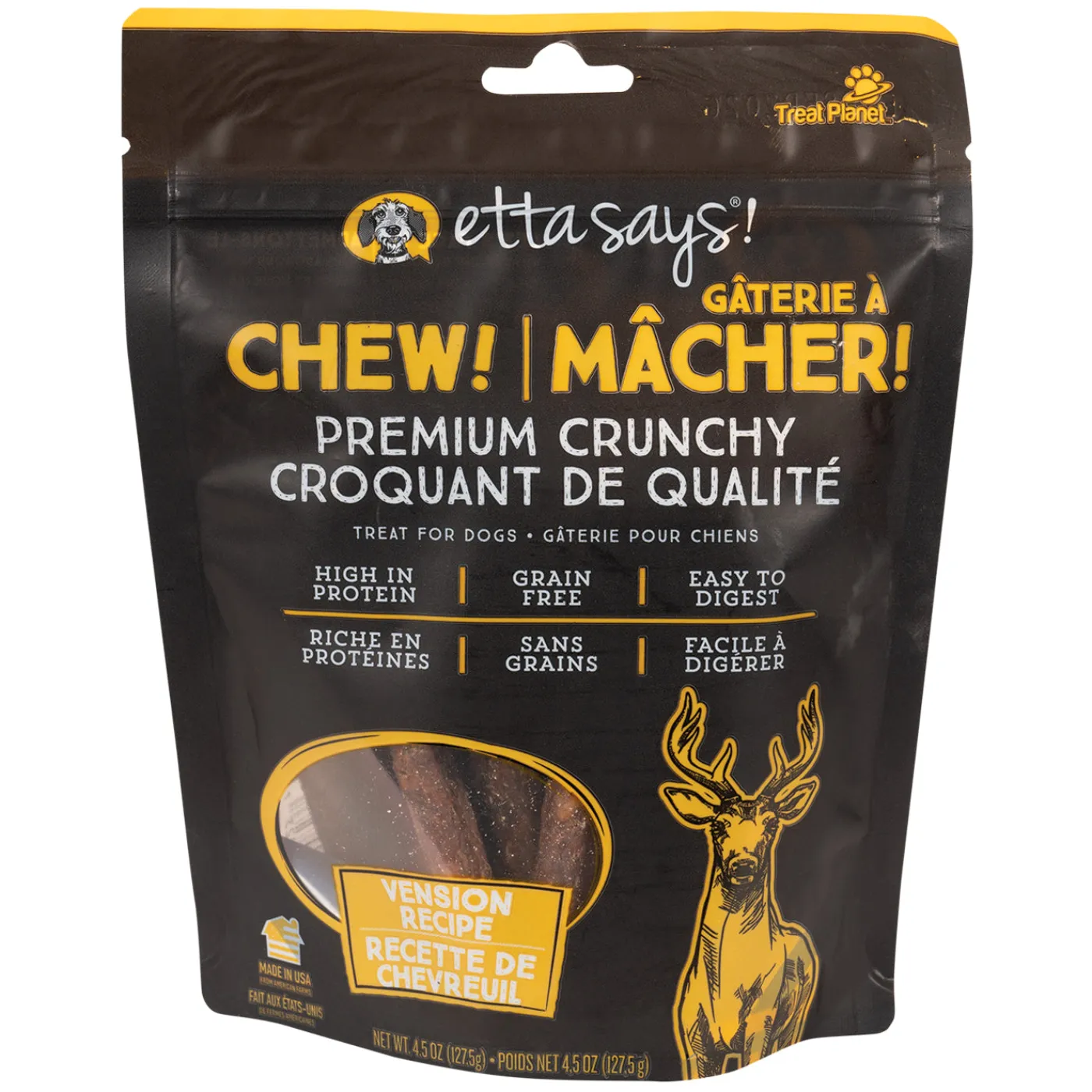 Etta Says! Crunchy Premium Chews are made from unique protein sources making them a great choice for pets with dietary restrictions. Made from premium proteins and totally odourless, these chews are safer than traditional rawhide. Each chew is made using a proprietary manufacturing process that breaks down the rawhide and blends it with high quality proteins sourced from American farms. As an added bonus, these chews won’t stain carpet or other surfaces.