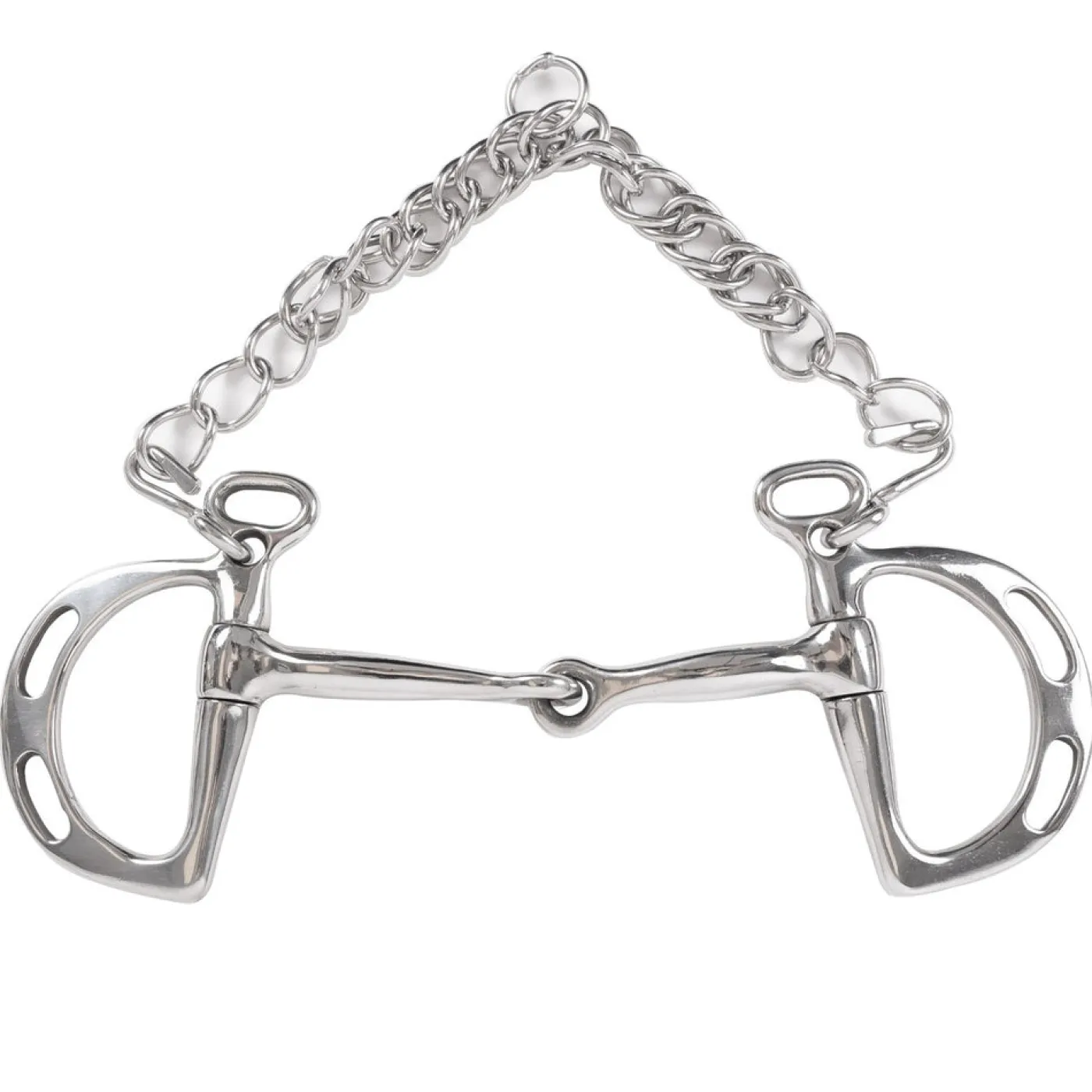 The EvoEq Single Jointed Kimberwick Bit offers a stainless steel, lightweight, and slotted kimberwick bit. The mouth of the bit is jointed with a curb chain and hooks for added leverage. Suitable for intermediate horses.