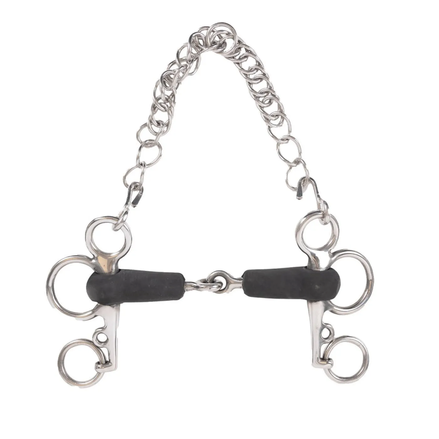 The EvoEq Tom Thumb Jointed Rubber Pelham Bit is designed to combine the effects of a snaffle and curb, helping to encourage the horse to bend at the poll through pressure applied by the curb rein. Crafted from a premium quality stainless steel for optimal durability and featuring a soft rubber covering on the mouthpiece for enhanced comfort. The single-jointed mouthpiece creates a nutcracker action to help prevent the horse from leaning on the bit. Featuring shorter shanks than a typical Pelham and complete with a curb chain.