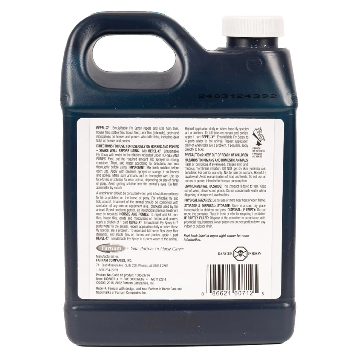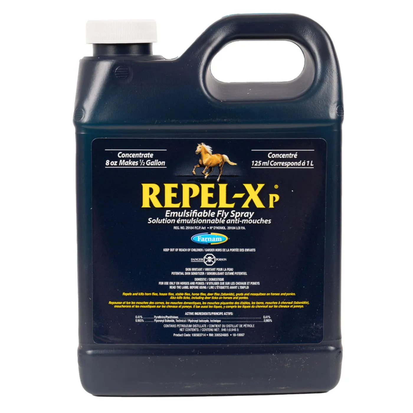 Farnam Repel-Xp repels and kills horn flies, house flies, stable flies, horse flies, deer flies, gnats and mosquitoes on horses and ponies. Repel-Xp also kills ticks, including deer ticks on horses and ponies. This concentrated insect repellent makes a 1/2 gallon of fly spray from only 8 oz of concentrate.
