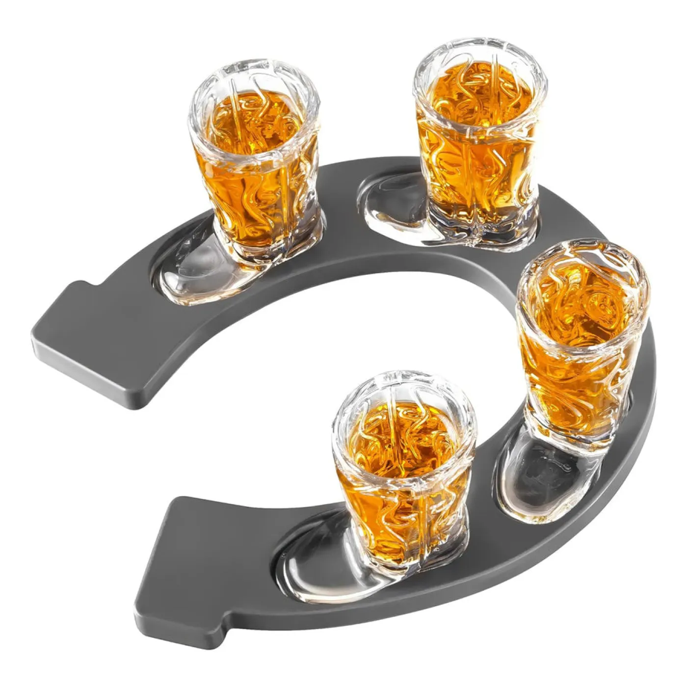 Add a touch of Western flair to your next gathering with the Horseshoe Boot Shot Glass Set. This set includes four 1 oz. cowboy boot shot glasses, each made from thick, durable glass with a classic Western design. The lightweight horseshoe-shaped serving tray features non-slip feet for easy handling and stability.