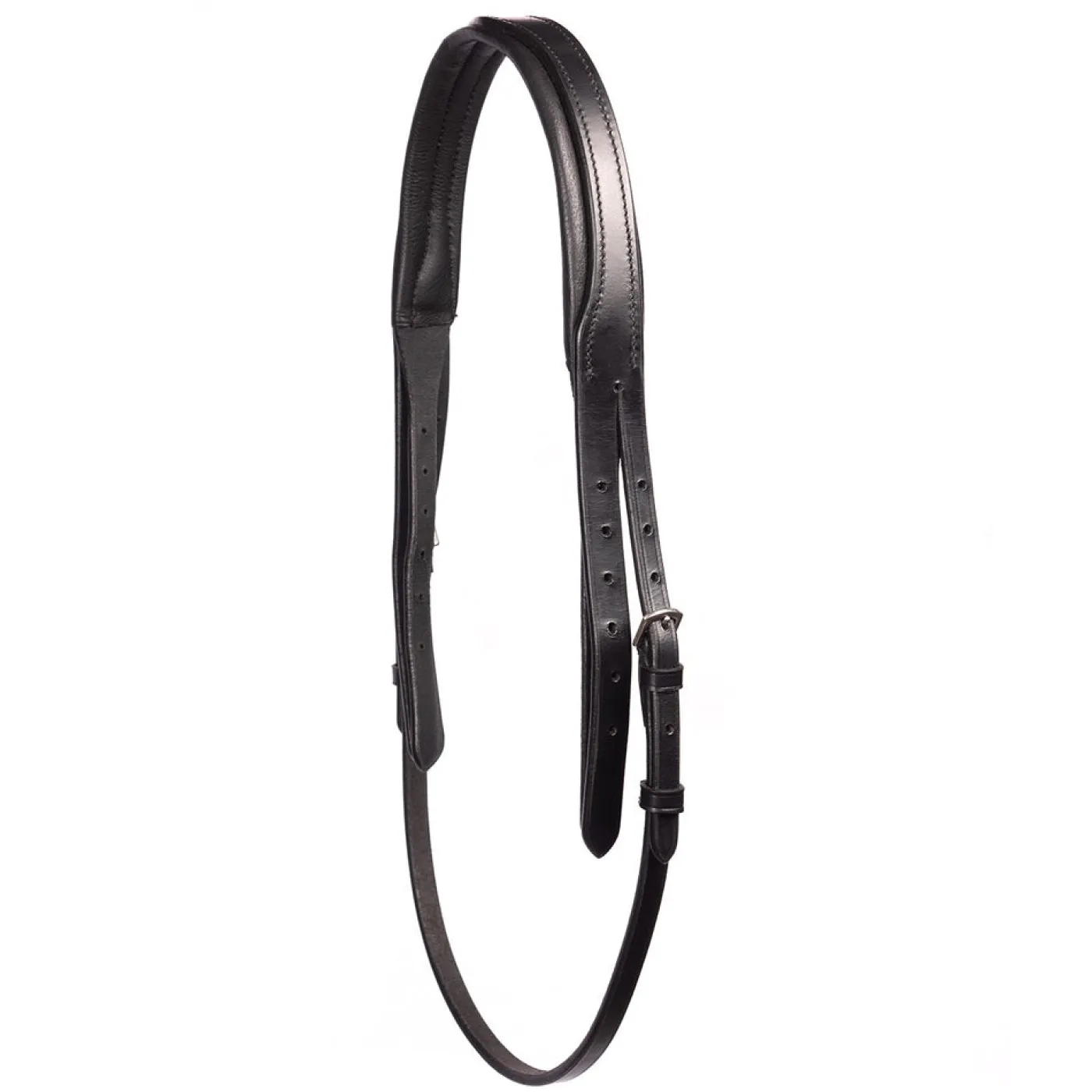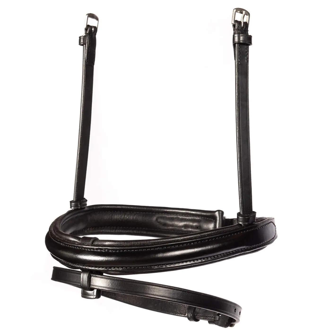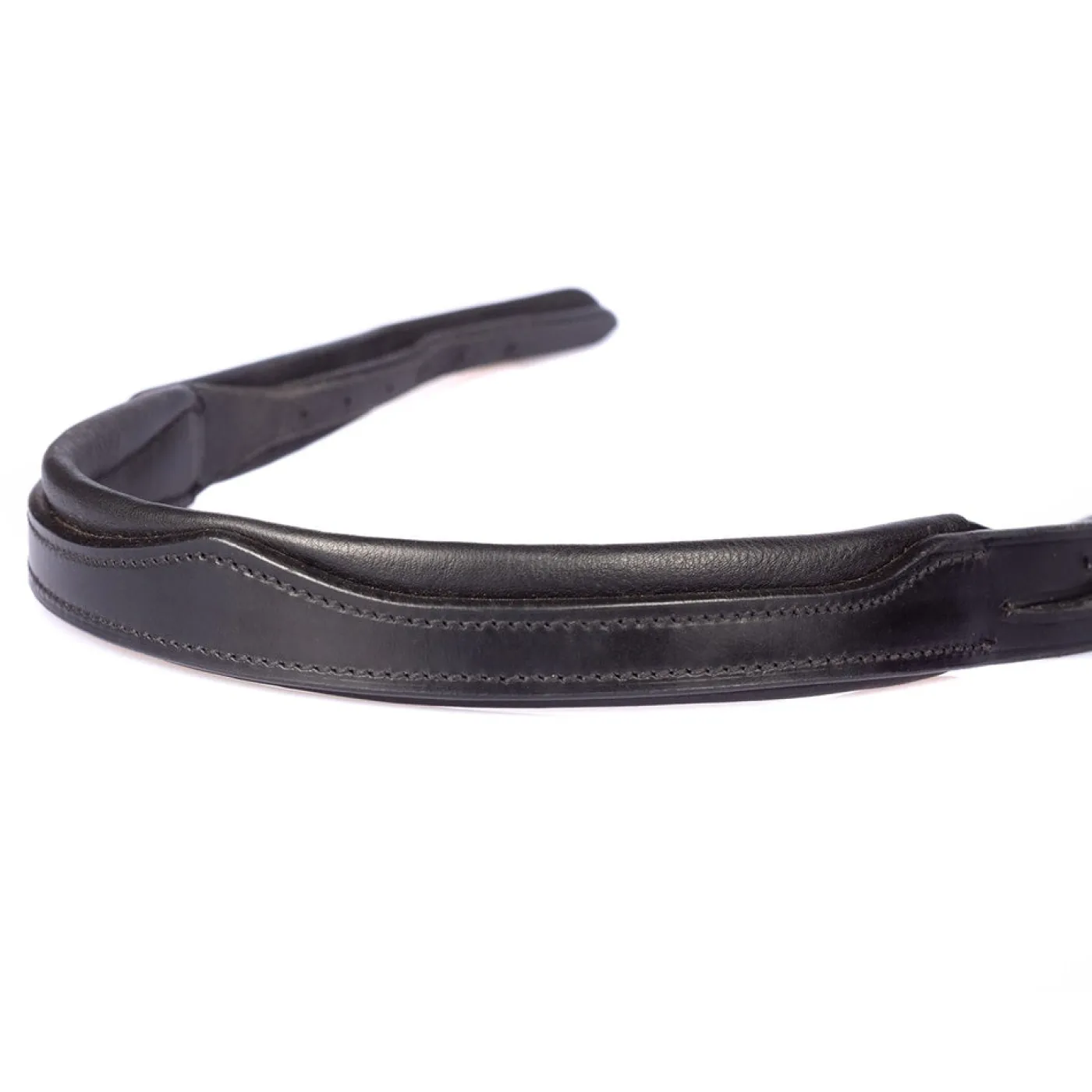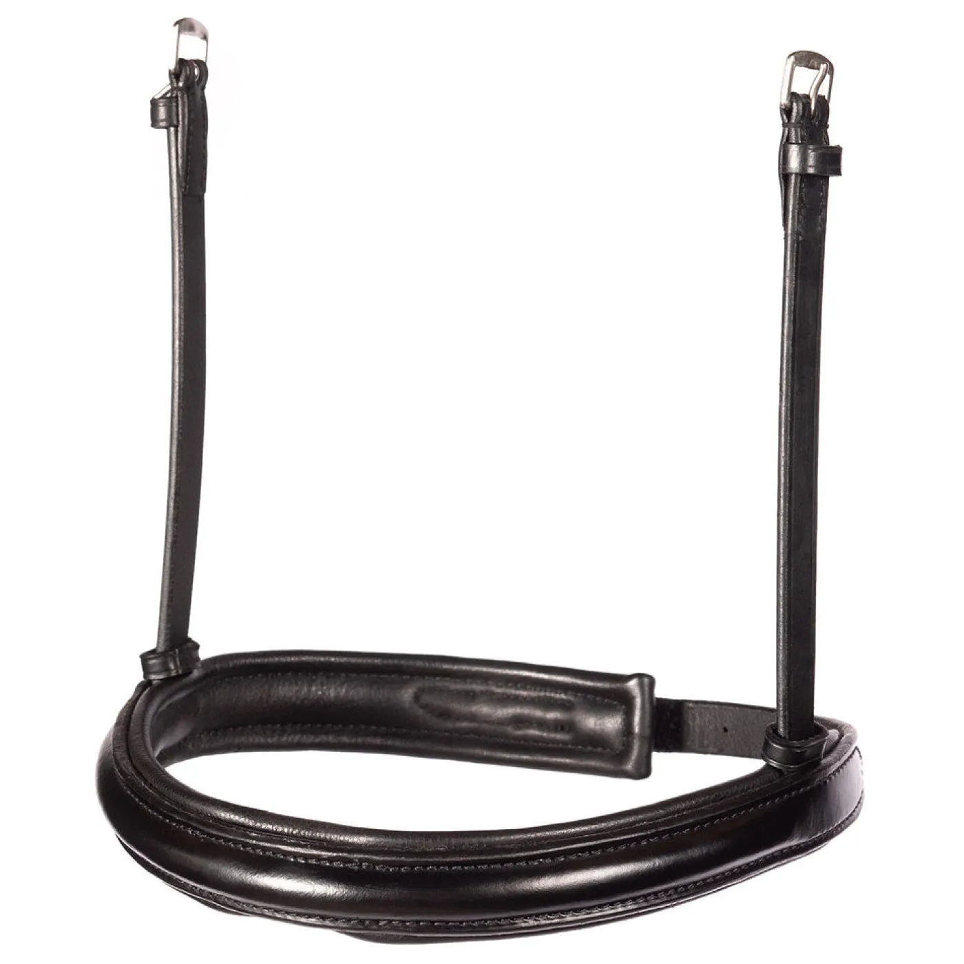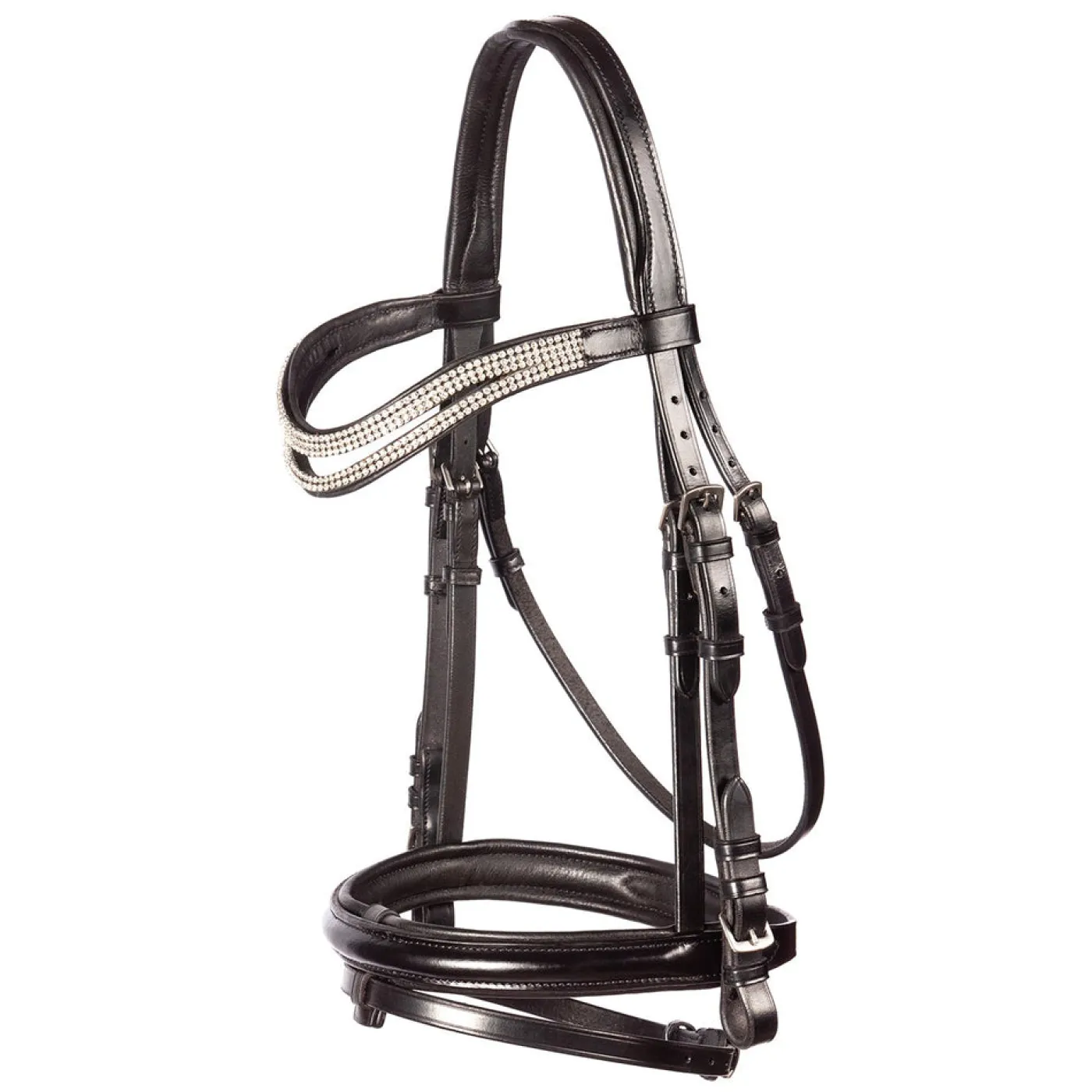 Black leather dressage bridle featuring a flattering, split crystal browband for a stylish, eye-catching look. Crafted with inset crystals to help offer added durability. Complete with a convertible cavesson with a removable flash and buckle fittings. Reins not included.