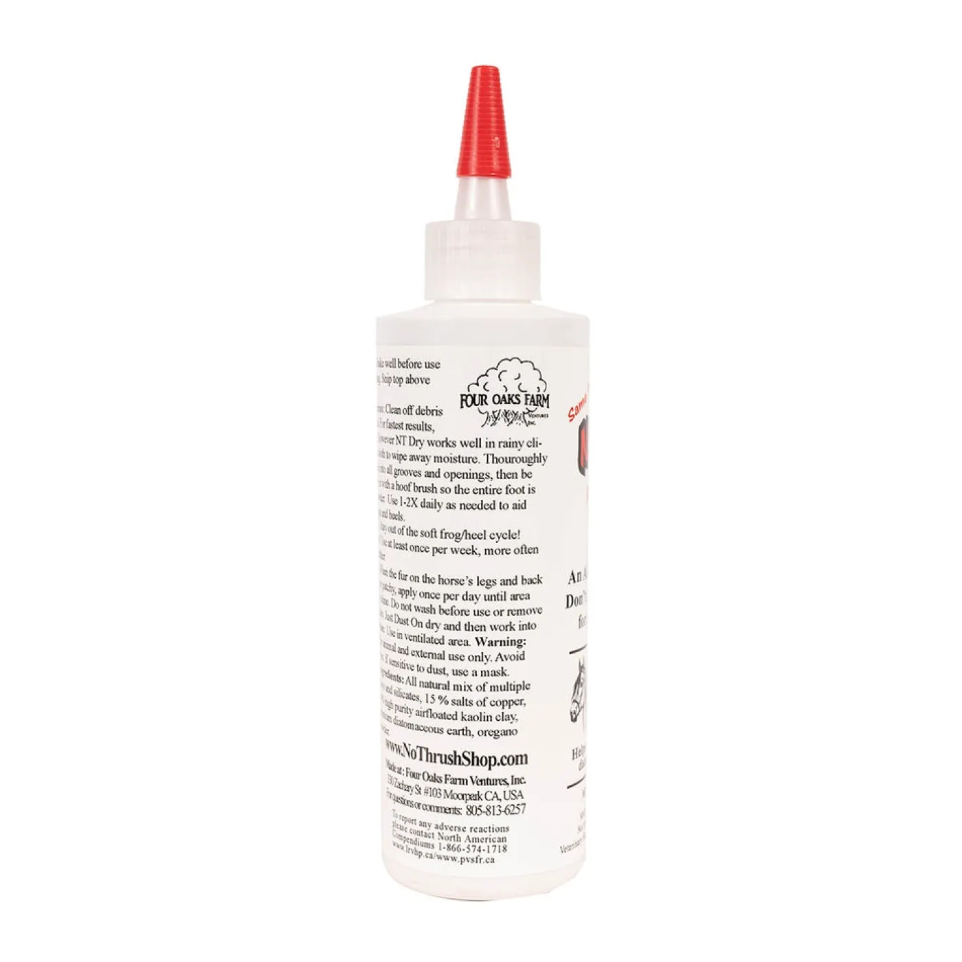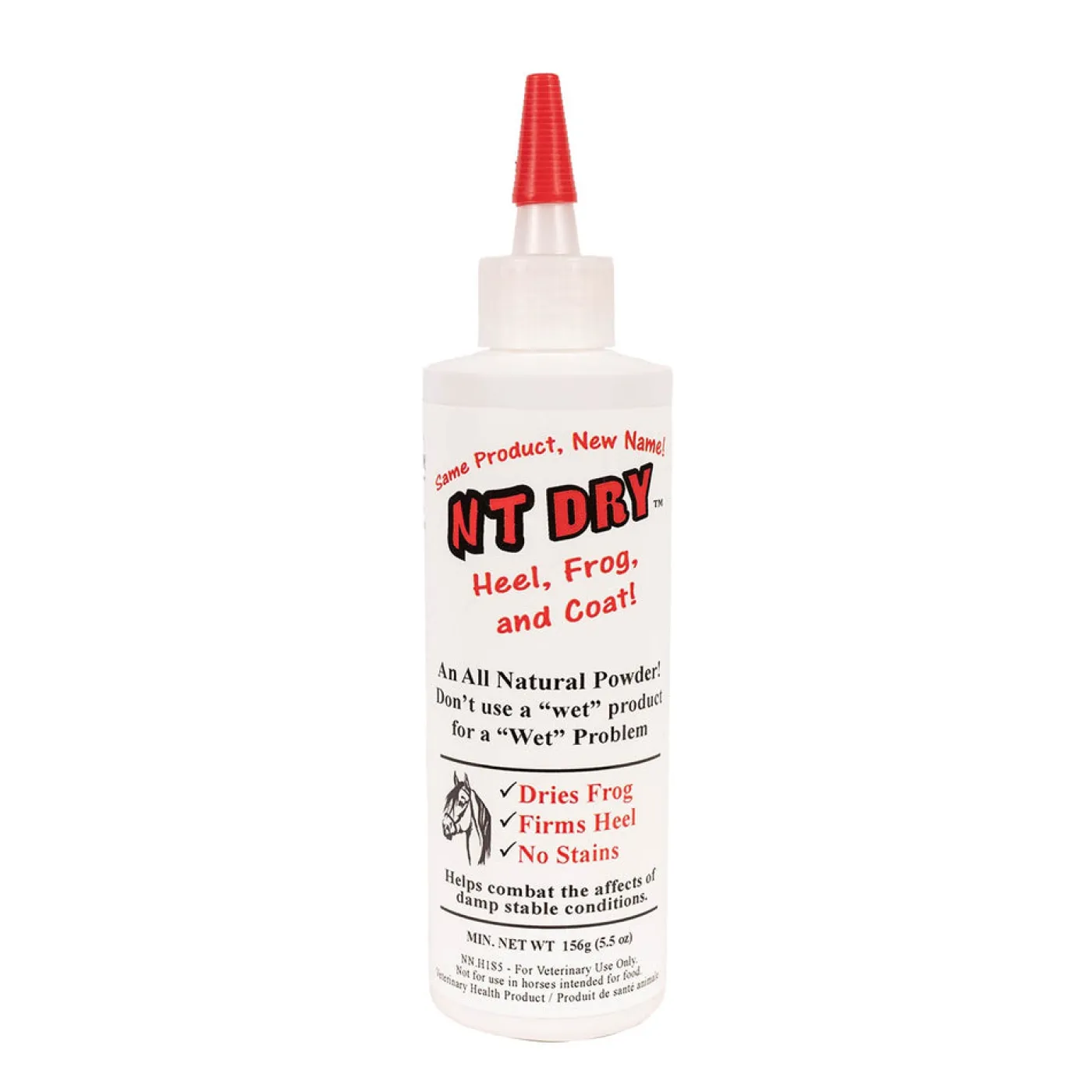 NT Dry Powder may be used to aid against moisture build up in the frog or sole, helping to support a firm and dry heel and frog. All-natural, and non-staining with an easy to use, thin tipped squeeze bottle.
