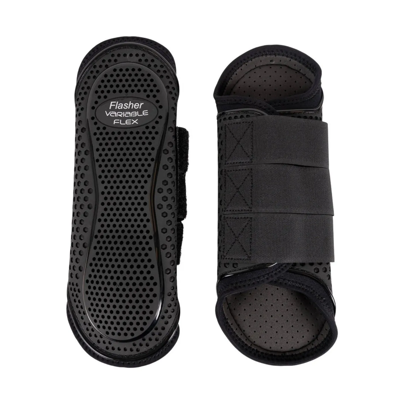 Flasher VH Flex Boots are a lightweight, tough splint boot to protect your horse’s legs during exercise. These boots features a flexible strike pad that contours to the horse’s leg, and a breathable, perforated neoprene lining. Air vents in the outer shell maximize airflow and help keep tendons and ligaments cool. Finished with a secure three strap Velcro closure. Sold as a pair. One size fits most – sized for an average horse.