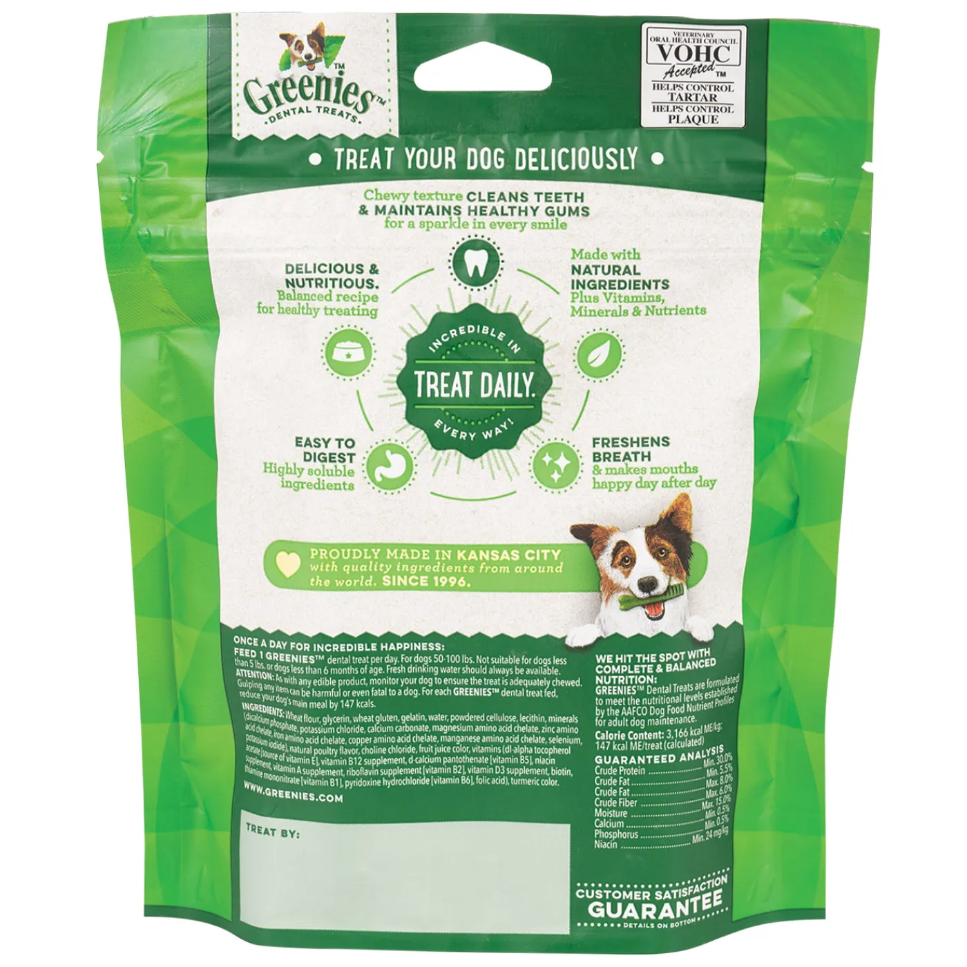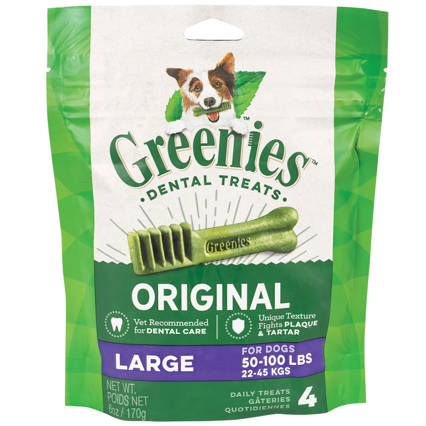 Greenies Mini Treat Pak™ contains delicious, chewy treats for your dog that promote tooth care. These treats are shaped to clean your dog’s teeth, having been designed while considering how dogs chew food. Greenies also feature a chewy texture that will fight plaque, tartar buildup and contains ingredients to freshen offensive doggie breath.