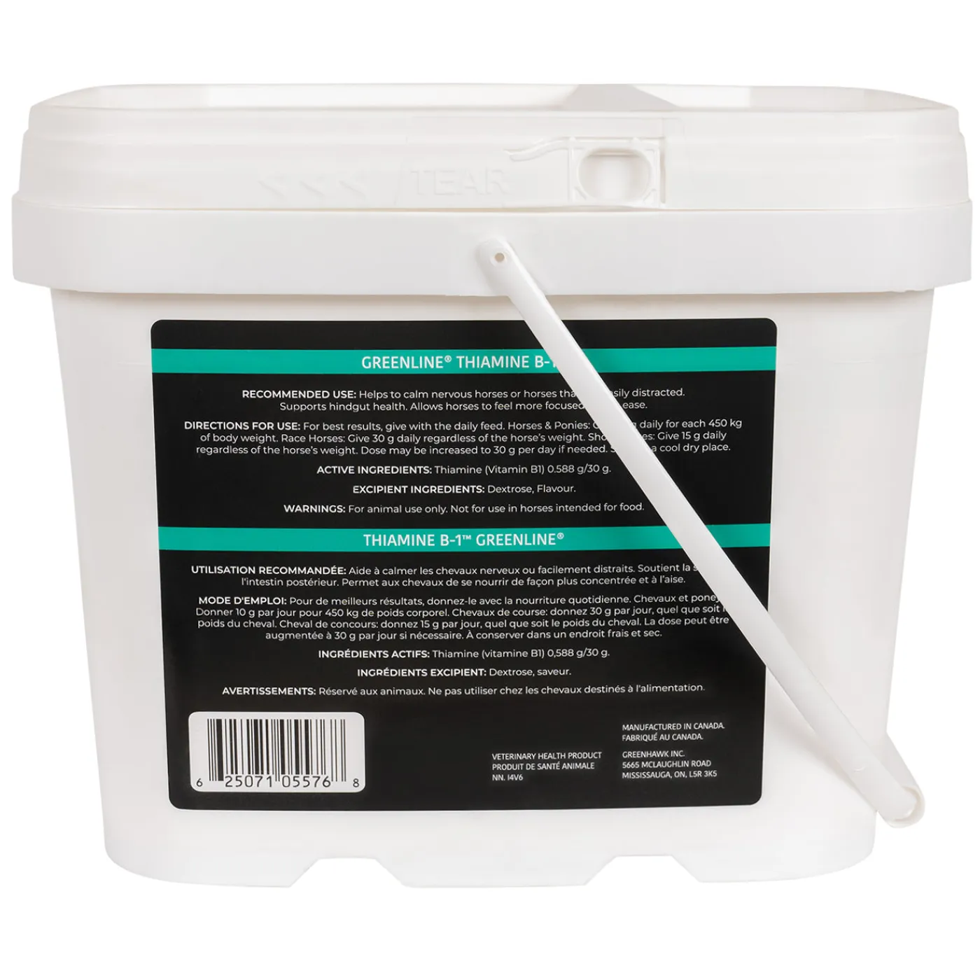 Greenline is the leading supplementation program at racetracks and competitive barns across Canada. Greenline Thiamine helps to promote a healthy hindgut and overall horse health. Thiamine (Vitamin B1) plays a role in the proper transmission of nerve impulses, allowing horses to feel more focused and at ease. Ideal for active, working horses, this supplement helps allow horses to feel more focused and at ease. Supplement with Thiamine to help calm a nervous horse or to help focus horses that are easily distracted. Supports hindgut health. Greenline Thiamine Powder contains 500 mg of Thiamine per 30 g dose. Packaged in a convenient resealable tub. Proudly manufactured in Canada.
