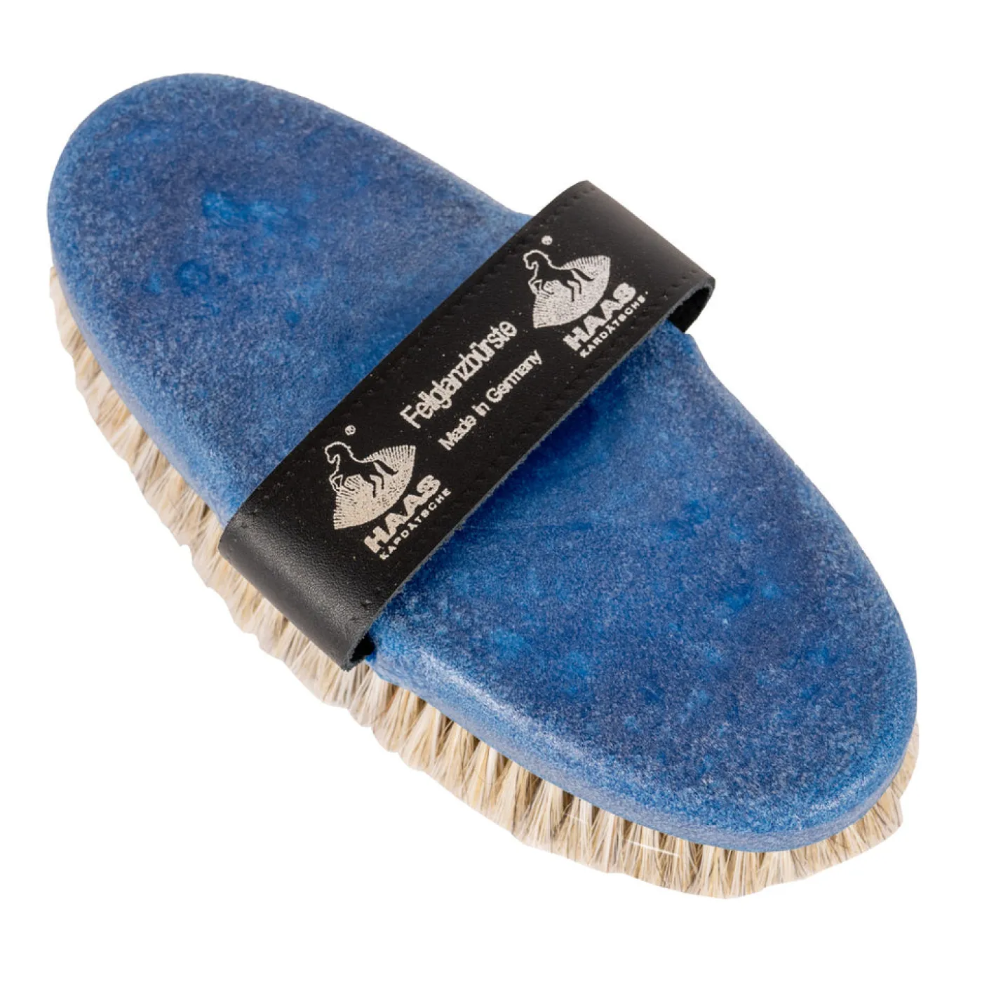 The Haas Fellglanzburste Brush is constructed with soft, white horse hair bristles and a leather wrist strap. Suitable as a finishing brush to remove dust from the body.