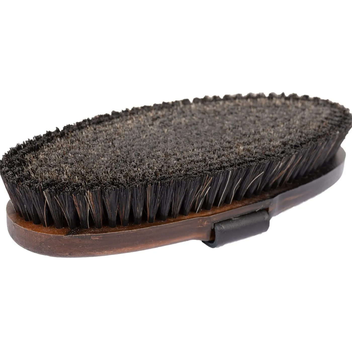 The Haas Parcour Brush is constructed with black and grey horse hair bristles and a leather wrist strap. Helps to remove dust and dandruff to reveal a soft, shiny coat.
