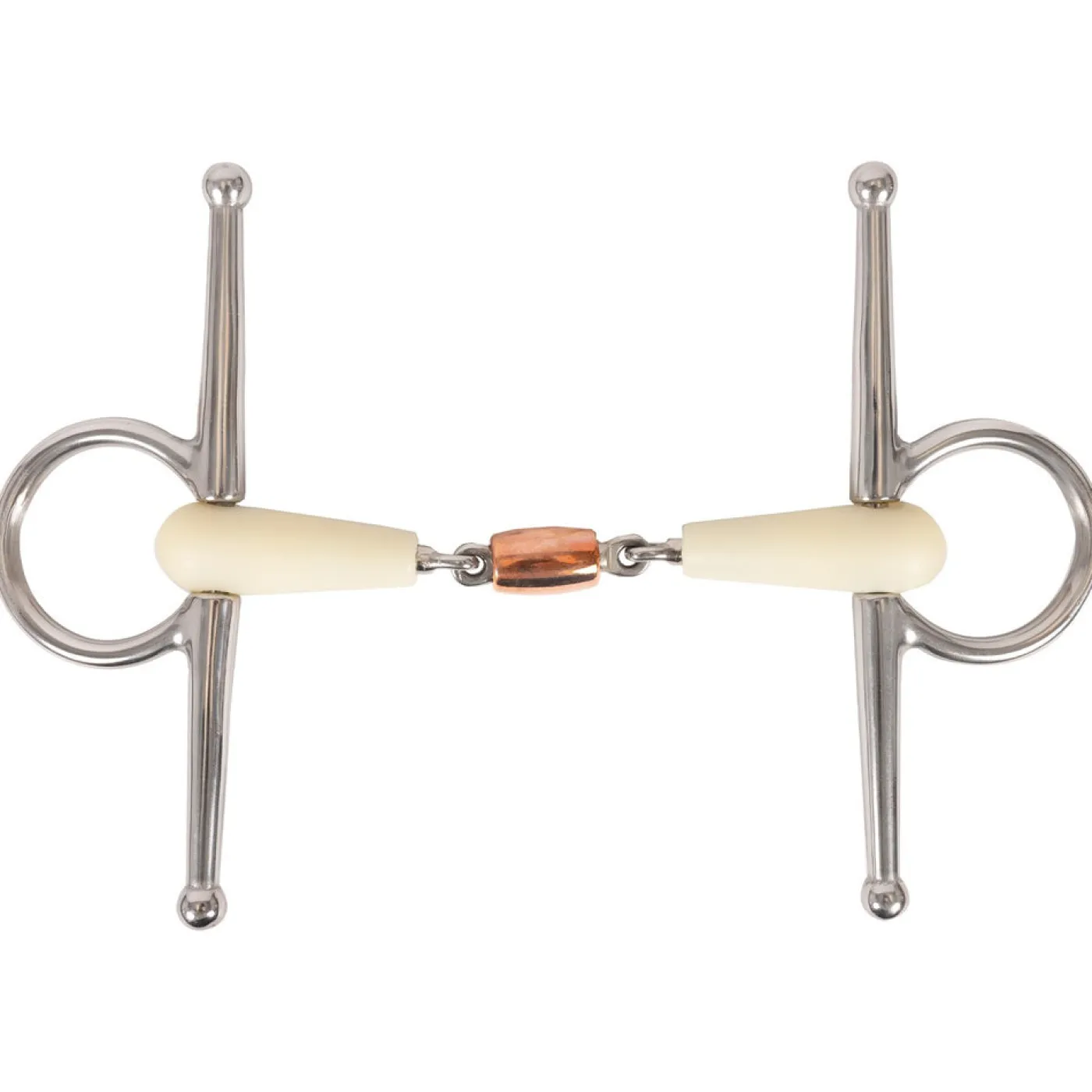 The Happy Mouth Full Cheek Copper Roller Bit features a combination of an apple scented space age polymer mouthpiece and a pure copper centre roller. The copper roller centre helps to improve bit acceptance by encouraging the horse to salivate while promoting relaxation. Complete with full cheek construction.