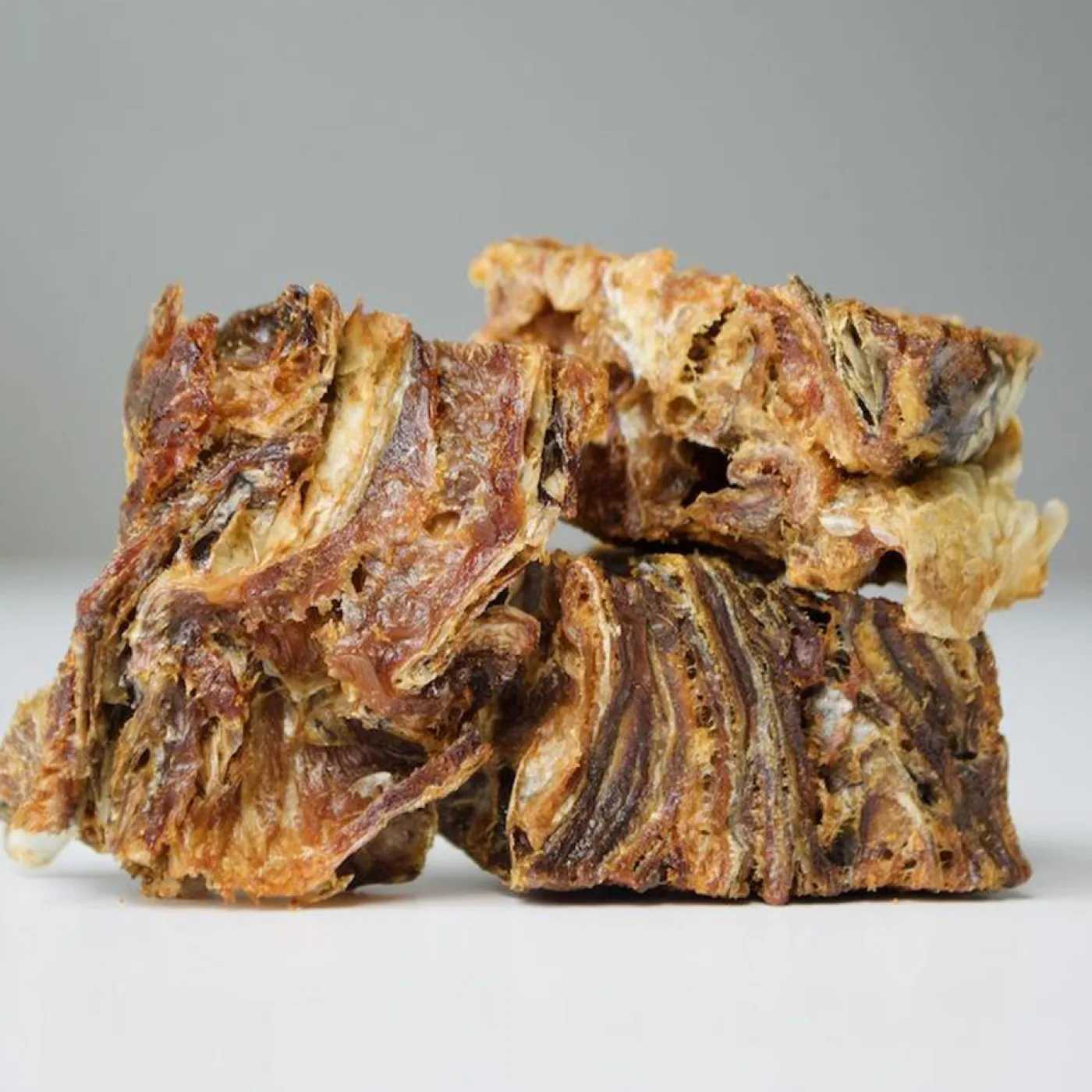 Made from 100% sustainable and wild-caught Pacific rock cod skins, these treats are the perfect hypoallergenic treat. Rich in Omega-3s for healthy skin and coat. Air-dried to retain nutrients, flavour and crunch. The perfect choice as a high reward training treat!