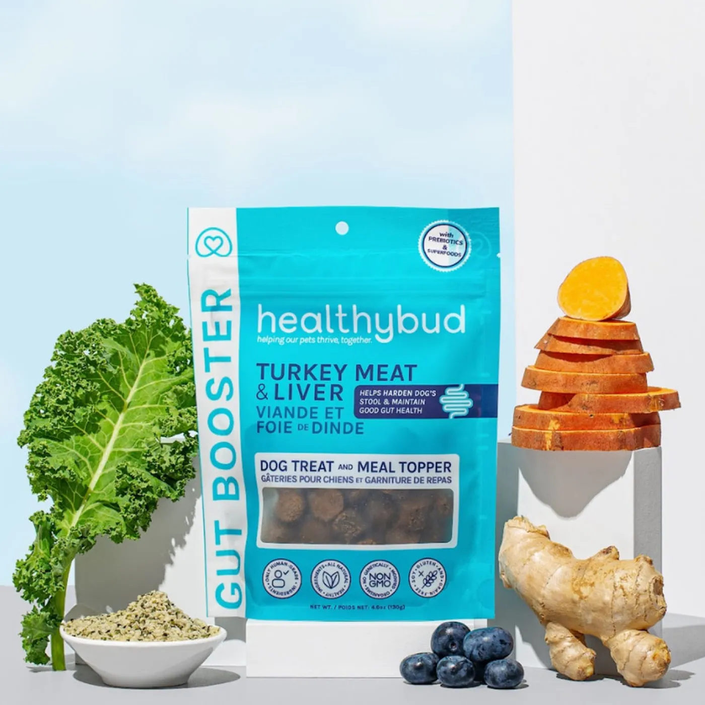 Healthybud Gut Booster helps to improve digestive health using prebiotics, digestive enzymes and superfoods for good gut bacteria. Packed with delicious flavour and nutritious ingredients that your dog will love. Can be used as a meal topper or as a treat. Made with all natural ingredients.