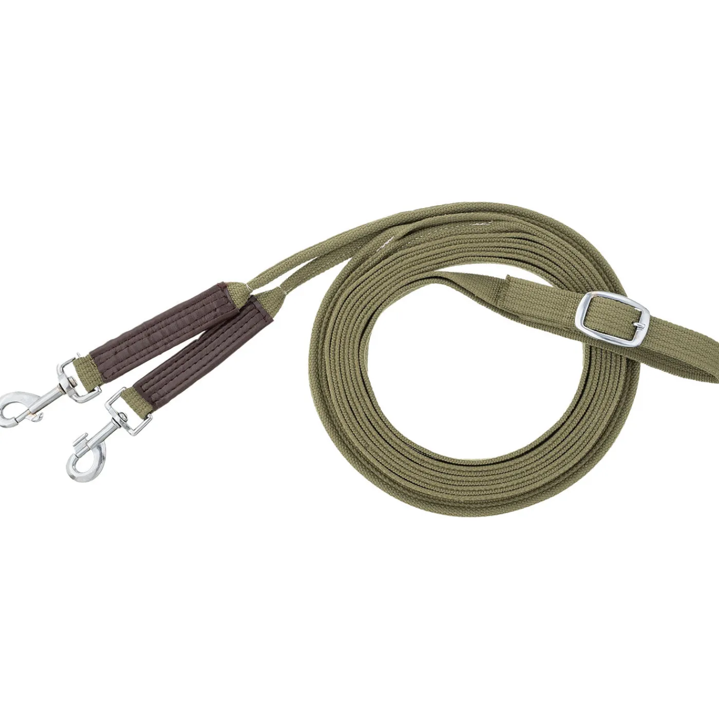 The Cotton Web Driving Lines are a great choice for long lining reins, training a young horse, or helping an older horse with straightness. These driving reins are made from durable cotton webbing with a sure grip handhold and rugged, reinforced snap ends. Each rein is partially rounded to allow easy use with a surcingle. Sold as a pair. Each line measures 12’6″/381 cm L.