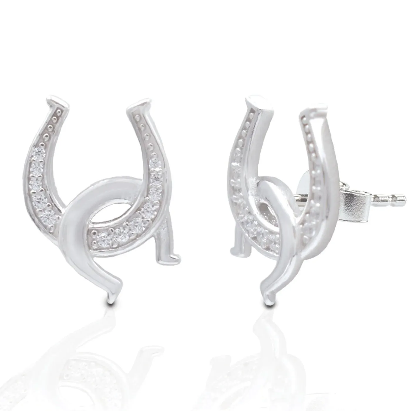Designed with equestrians in mind! The Kelly Herd Clear Double Horseshoe Earrings have one upright horseshoe enhanced with clear cubic zirconia stones and an interlocking smooth horseshoe hooked through.