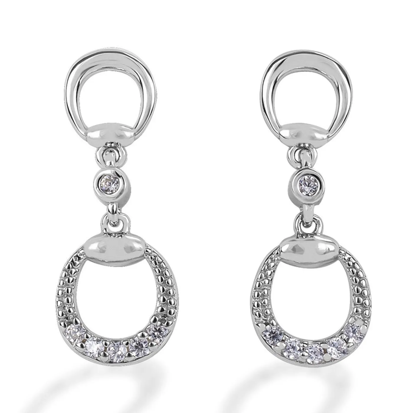 The Kelly Herd Eggbutt Dangle Earrings feature beautiful 0.925 sterling silver earrings shaped like an eggbutt snaffle bit with clear CZ stones on the drop half of the earring.