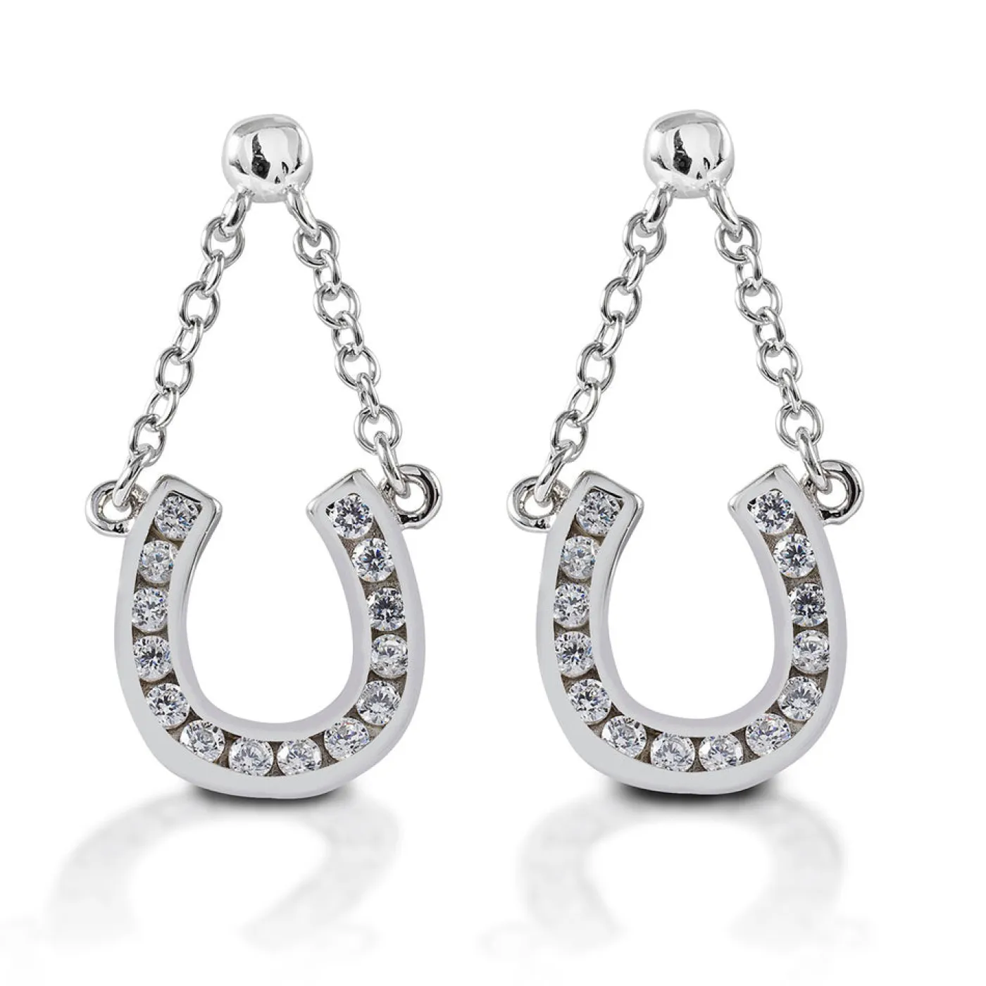 The Kelly Herd Horseshoe Dangle Earrings are made with 0.925 sterling silver and CZ and feature enhanced horseshoes dangling on tiny chains.