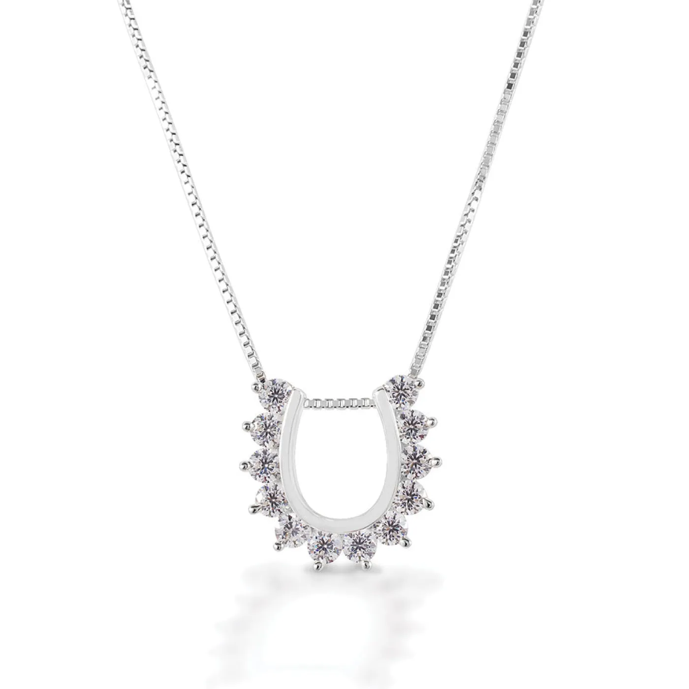 Designed with equestrians in mind! The Outside Set Horseshoe Necklace features a horseshoe shaped pendant with outside prong set cubic zirconia stones, creating a scalloped edge. Complete with an adjustable 16-18″ chain.
