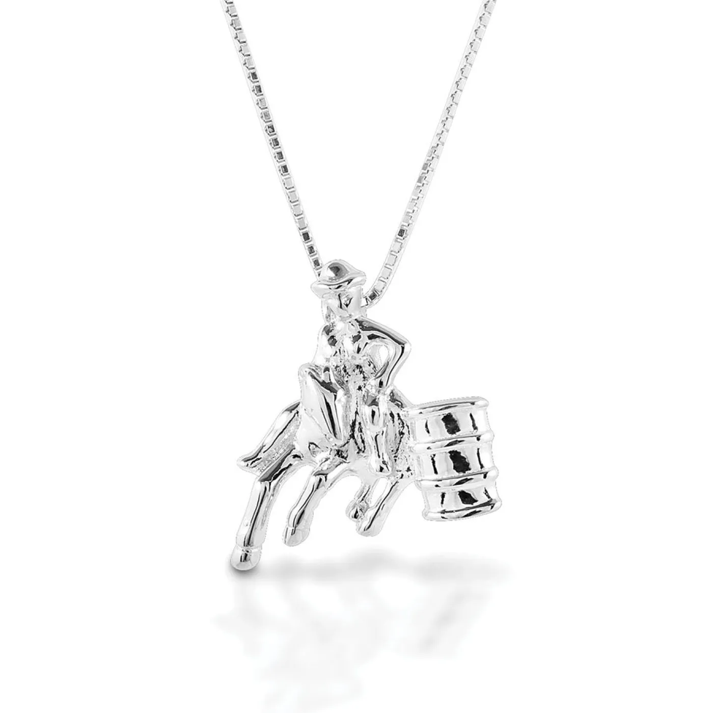 Designed with equestrians in mind! The Kelly Herd Small Barrel racing Pendant is crafted in sterling silver and perfect for the barrel horse rider! Complete with an adjustable 16-18″ chain.