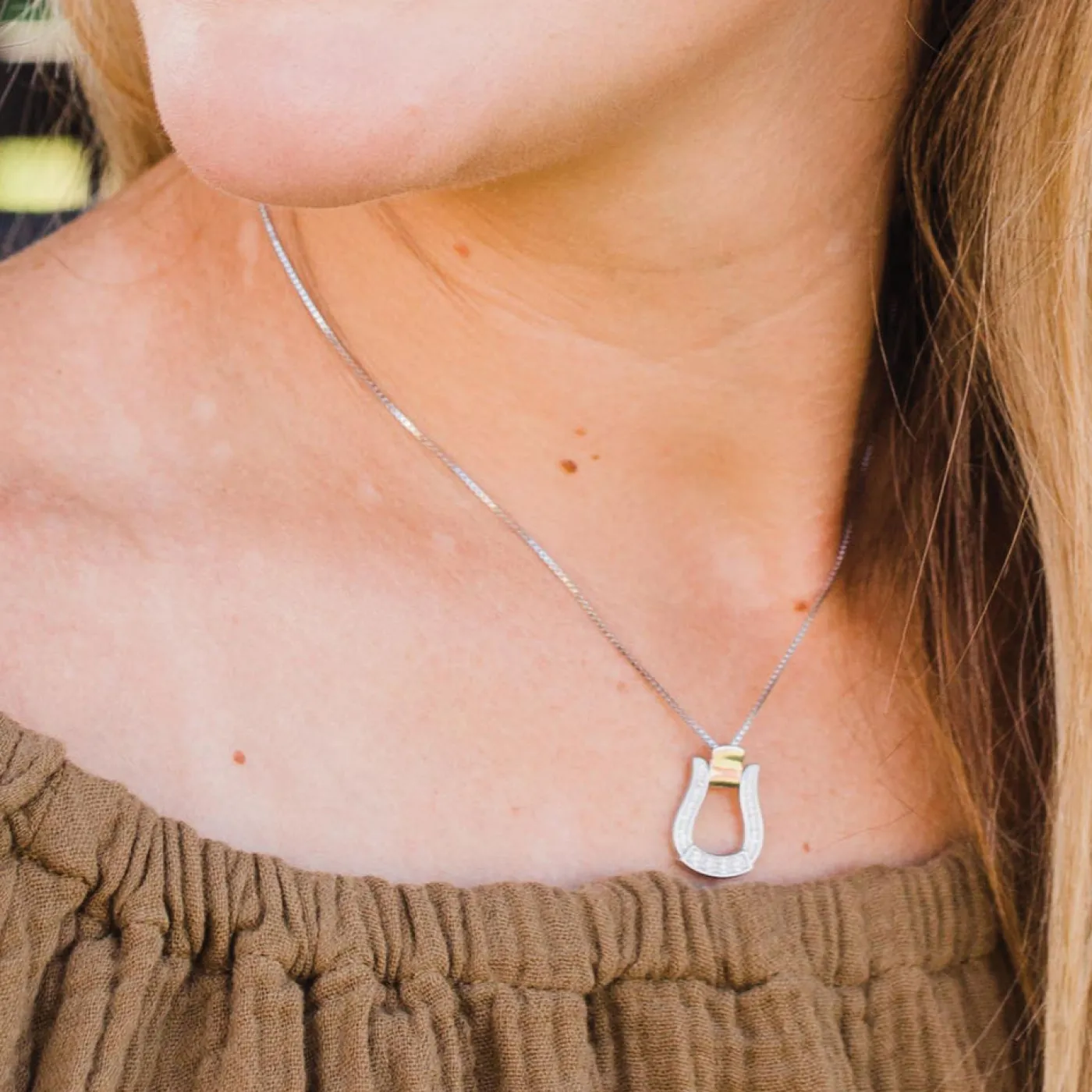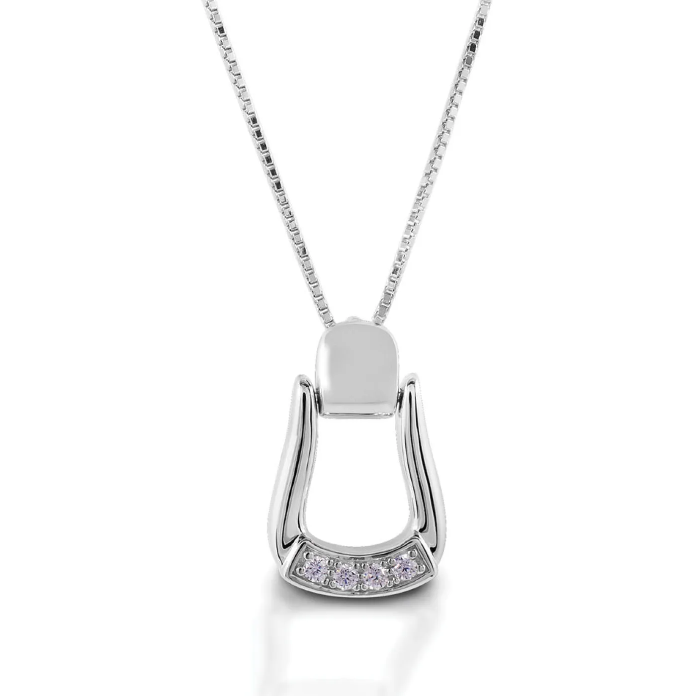Designed with equestrians in mind! The Kelly Herd Kelly Herd Small Stone Base Oxbow Stirrup Necklace features a Western oxbow stirrup shaped pendant with cubic zirconia stones. Made of sterling silver with an adjustable 16-18″ chain.