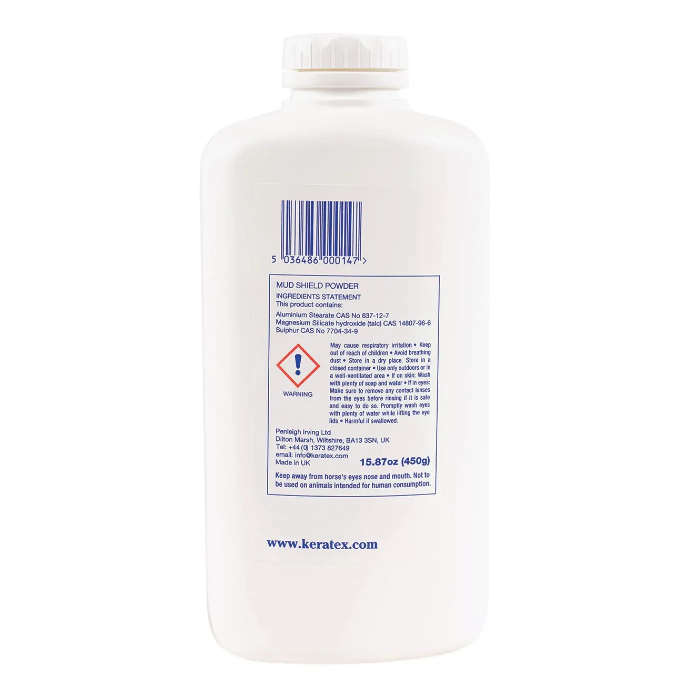 Keratex Mud Shield Powder is a highly-acclaimed, handy, easy-to-use powder for horse’s legs. Mud Shield powder creates a cleansing and waterproofing action on legs which are prone to scabs and broken skin in wet and muddy conditions. This light talc will give your horse’s legs a breathable, resilient coat of powder that does not absorb water and does not become sticky. It also works by making the leg hair so silky that mud cannot grip onto hair or soften the skin underneath. This respected product is widely recognized by the equestrian community as a leader in its field. Available in an easy-to-use puff bottle.