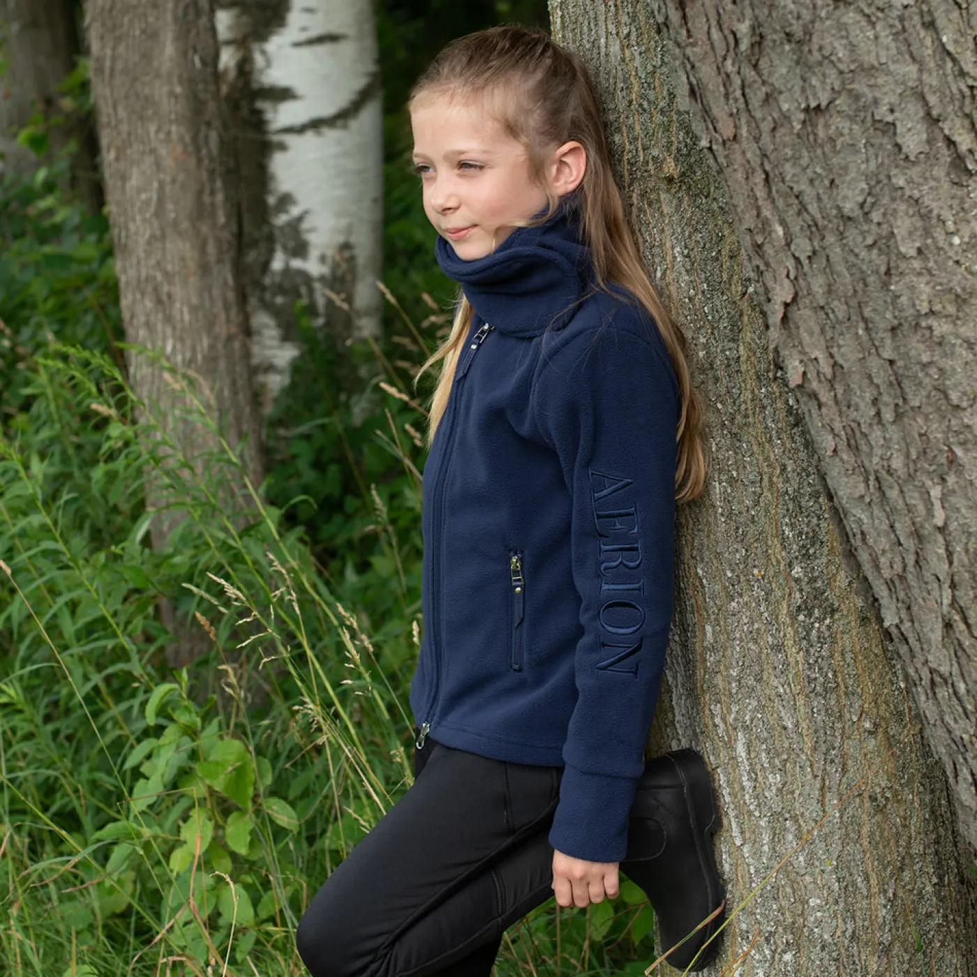 The Aerion Edie Fleece Jacket offers a fitted, and cozy fleece jacket with a wide overlapping collar to help keep you warm in or out of the saddle. The overlapping collar may be worn open or closed, to eliminate the need for a scarf. Features an underlaid 2-way front zip, front zippered pockets, cuffs with thumb holes, and Aerion embroidery on the sleeve. Perfect for chilly morning rides or for layering in winter months.
