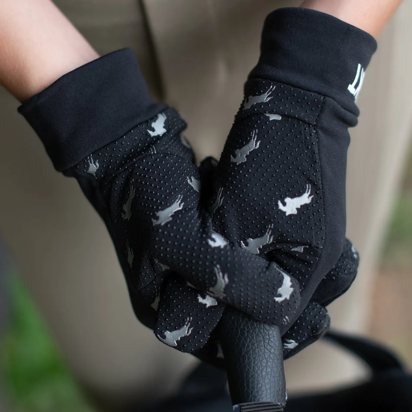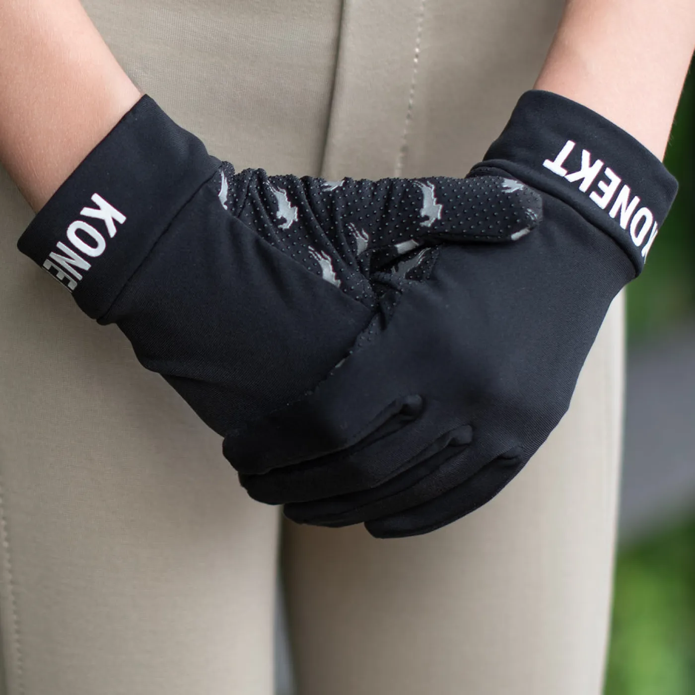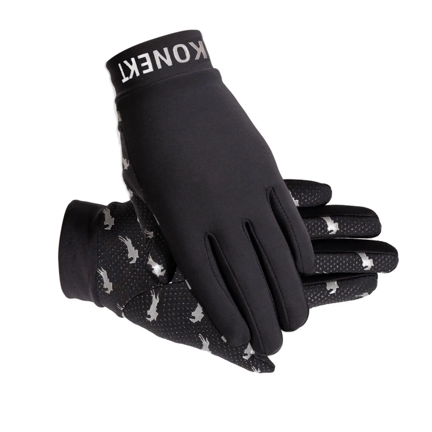 A lightweight summer riding glove made with super soft, stretchy, and comfortable fabric. A dotted silicone pattern covering the entirety of your palm in combination with the silicone horse pattern offers the utmost grip. Crafted with polyester and spandex.