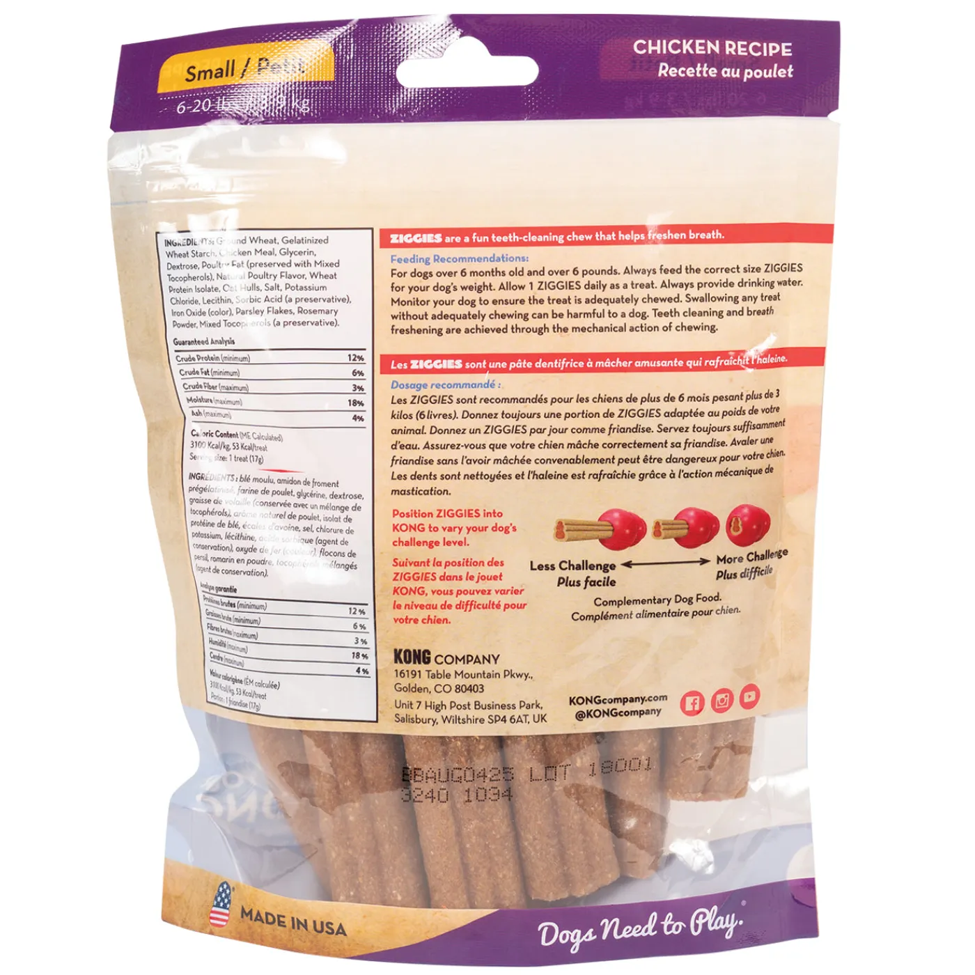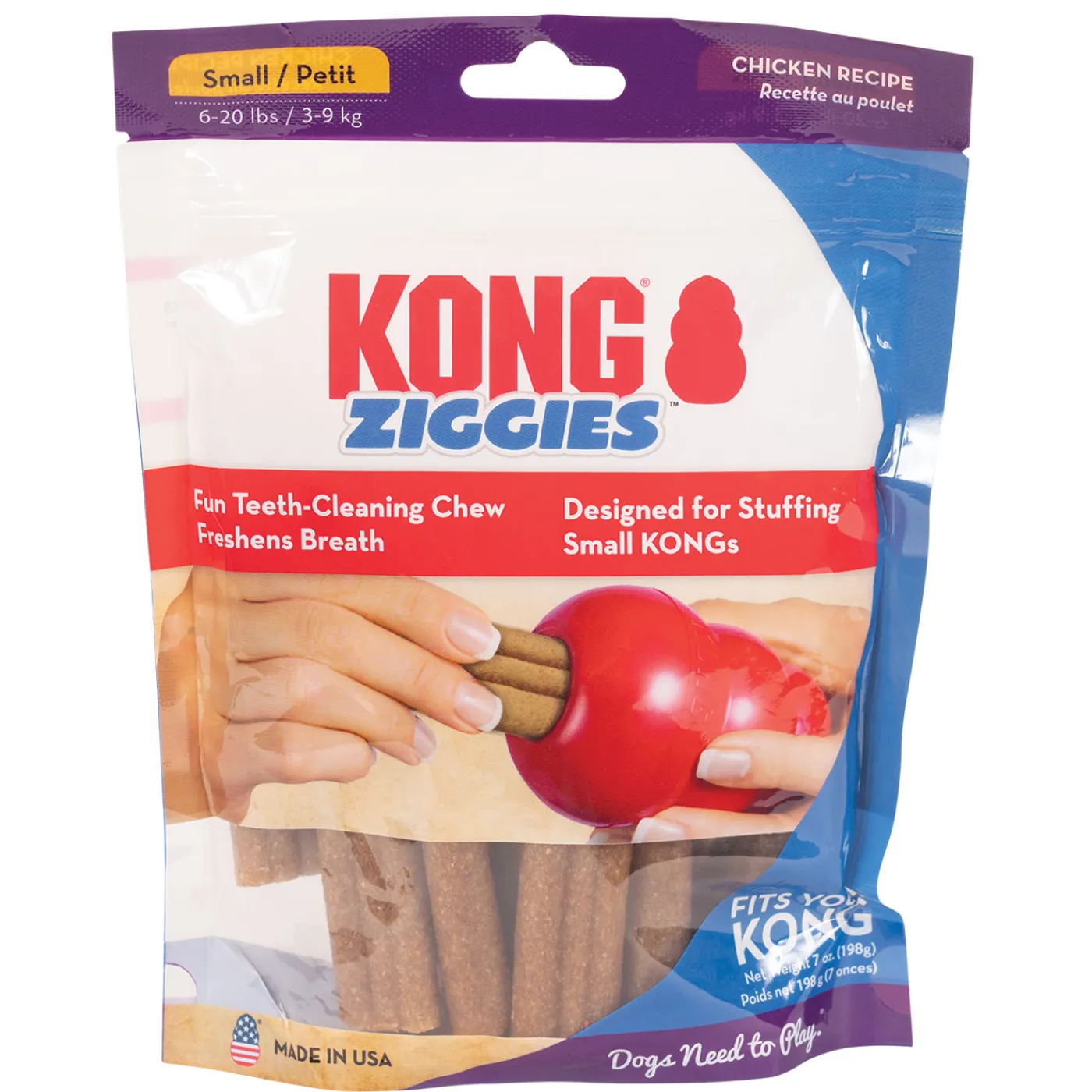 Perfect for stuffing in a KONG toy or for giving as a treat by itself. When stuffed in a KONG, treats will keep your dog entertained and stimulated. The outer layer consists of a tasty, chewy biscuit surrounding an irresistible, meaty chicken core. The unique chewy texture helps remove plaque and food debris, cleans teeth and freshens breath. Ziggies contain highly digestible proteins, plus natural parsley and rosemary to help tame bad breath. The dual layers and textures produce a long-lasting chewy treat that won’t crack or splinter