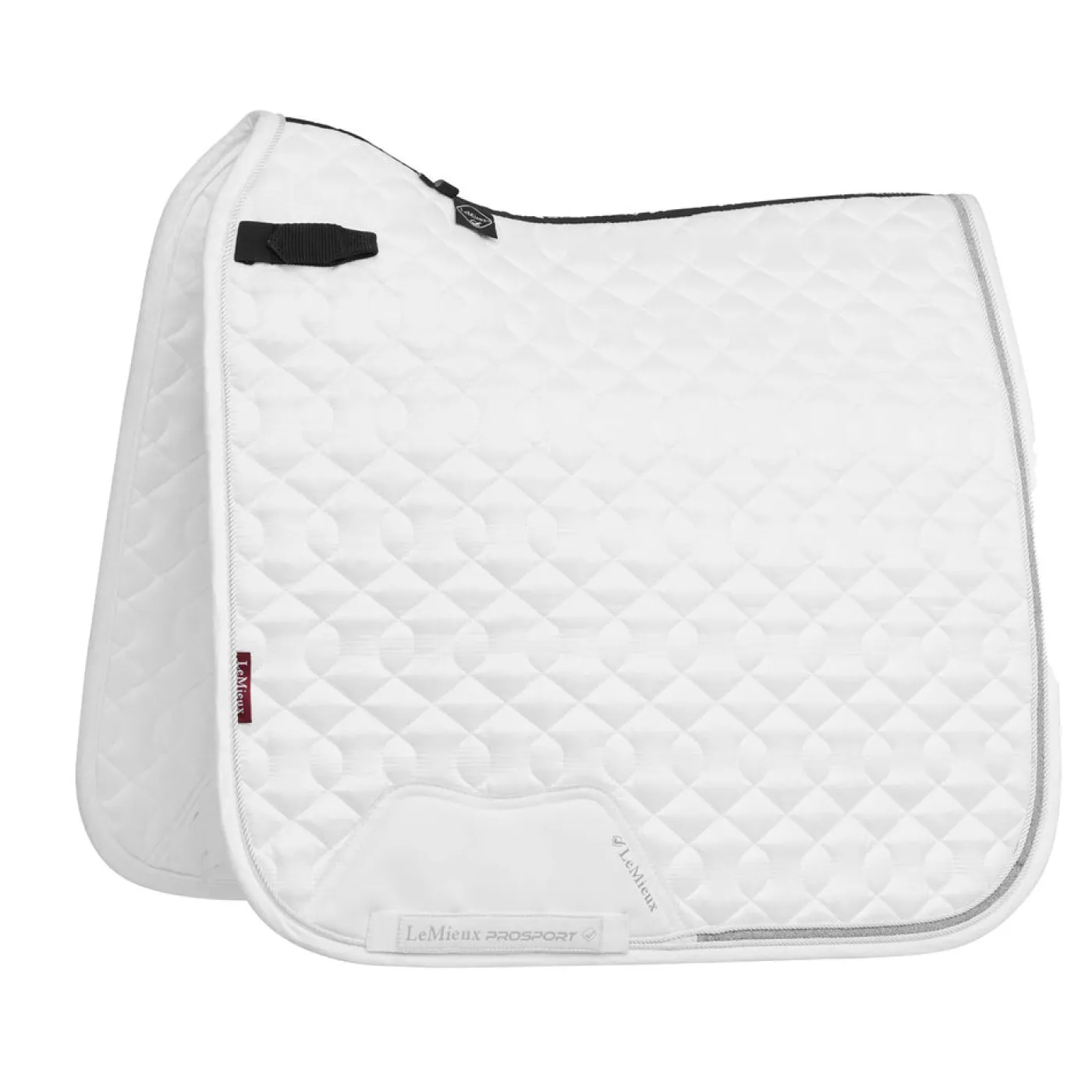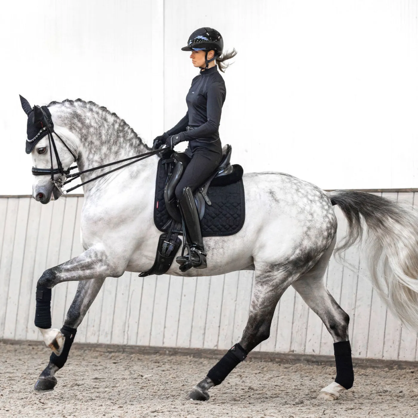 The LeMieux Crystal Suede Dressage Saddle Pad is designed for a secure fit under Dressage saddles and features a bamboo lining, durable faux leather girth protection area, and a sparkle and braided detail trim for added style. The bamboo lining is friction-free, and helps to quick sweat and moisture away from the horse’s skin. Complete with a high wither profile for added comfort.