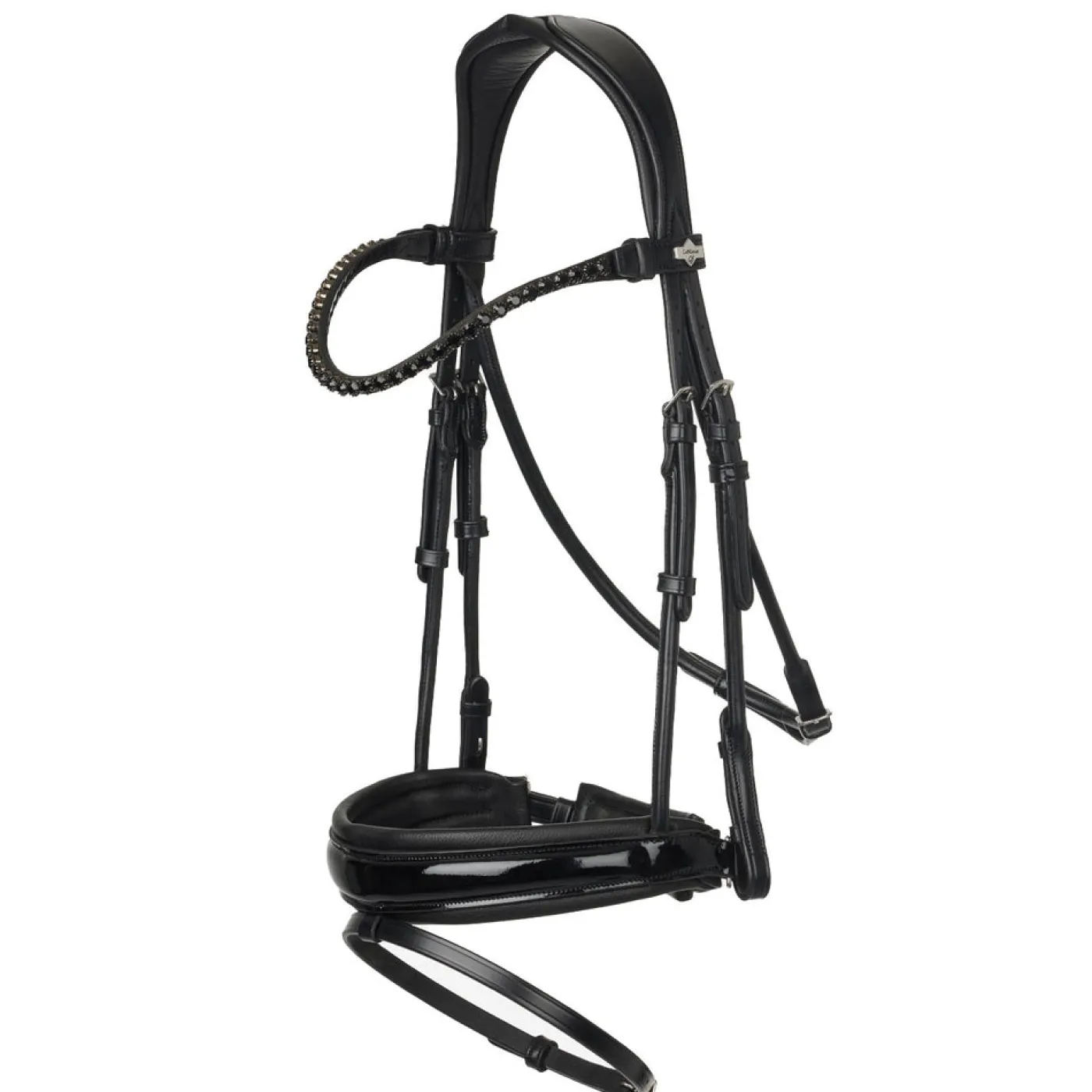 The LeMieux Kudos Patent Dressage Bridle offers a contemporary twist on a classic style. Features an anatomically shaped, delicate, and detachable clincher browband with crystal detailing and a padded crank noseband that offers roller buckles on the crank strap and flash. The throat latch fastens discretely under the jaw for a slimline appearance.