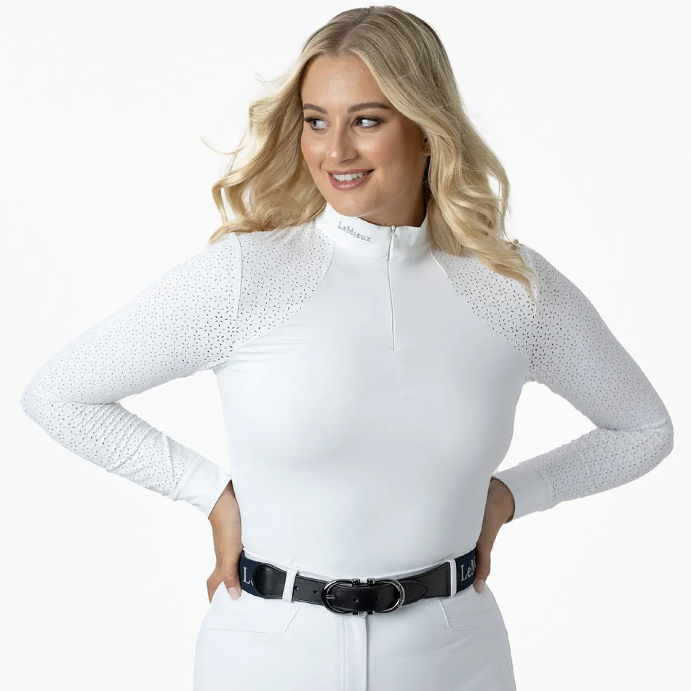 The LeMieux Olivia Show Shirt, made of super-soft stretch fabric, provides the perfect blend of elegance and performance. Delicate, laser-cut lace sleeves and back detail provide subtle beauty while also allowing airflow through the shirt to regulate heat and moisture. An invisible front zip closure keeps the shirt sleek. The shirt is finished with a white show collar with LeMieux stud detail.