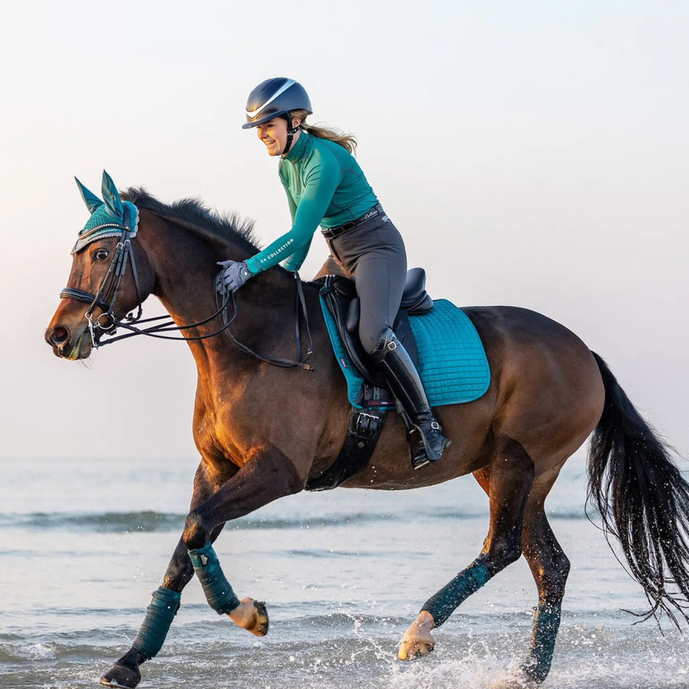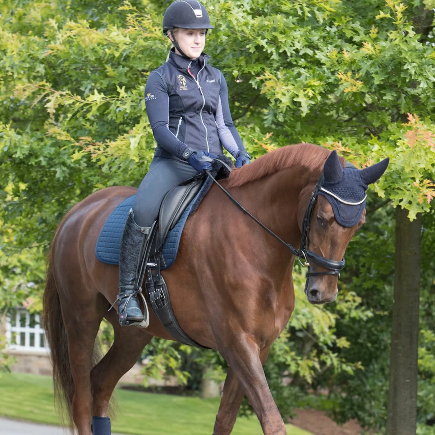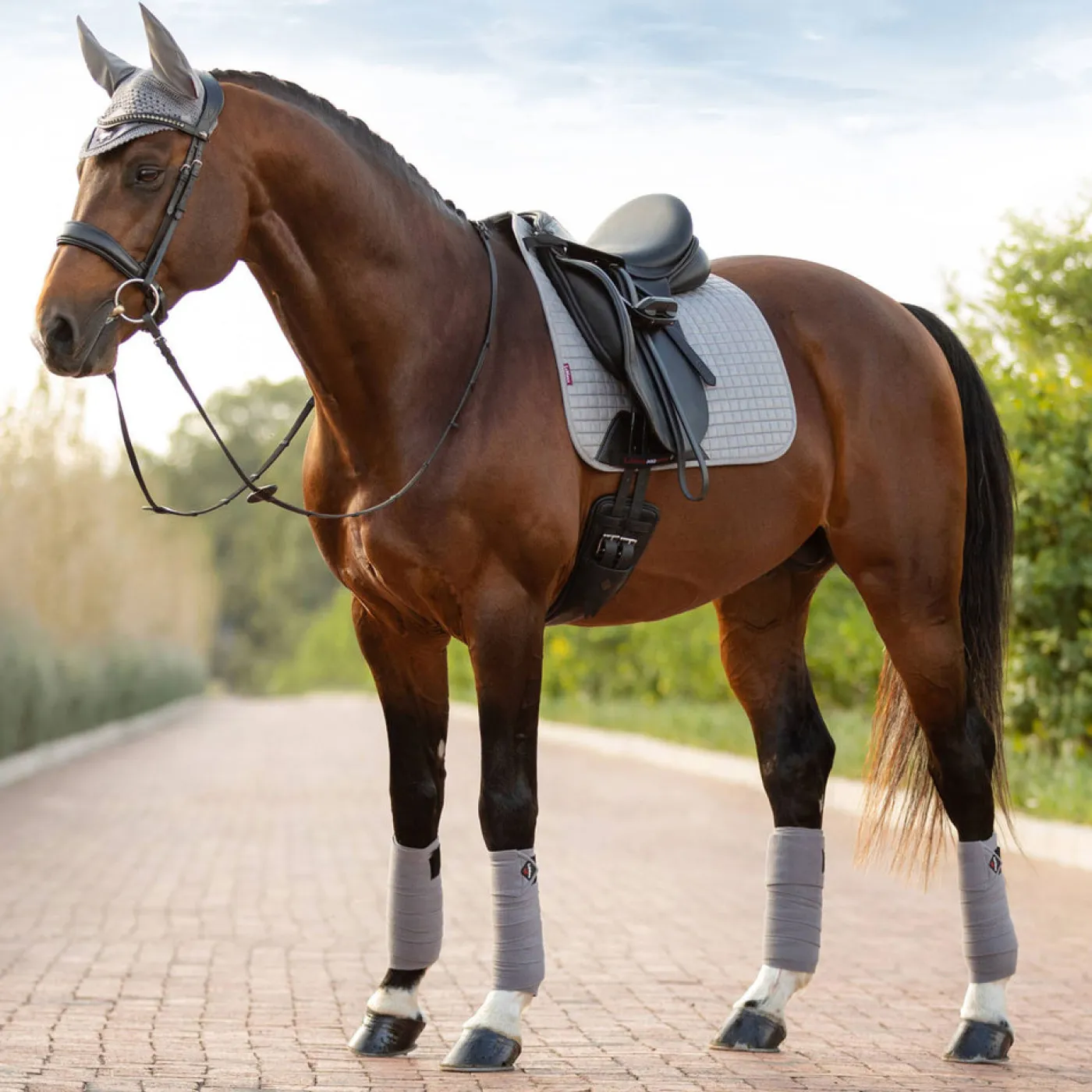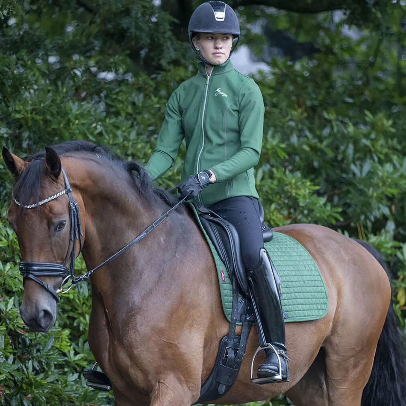 The Lemieux Suede Dressage Pad offers a sleek and professional appearance. Constructed with a suede top and binding, complimented by a super soft Bamboo lining to help absorb and control sweat under the saddle. Features PU leather girth protection with a close contact cut, high wither, and d-ring tabs. Complete with girth keepers incorporated with inner locking loops.