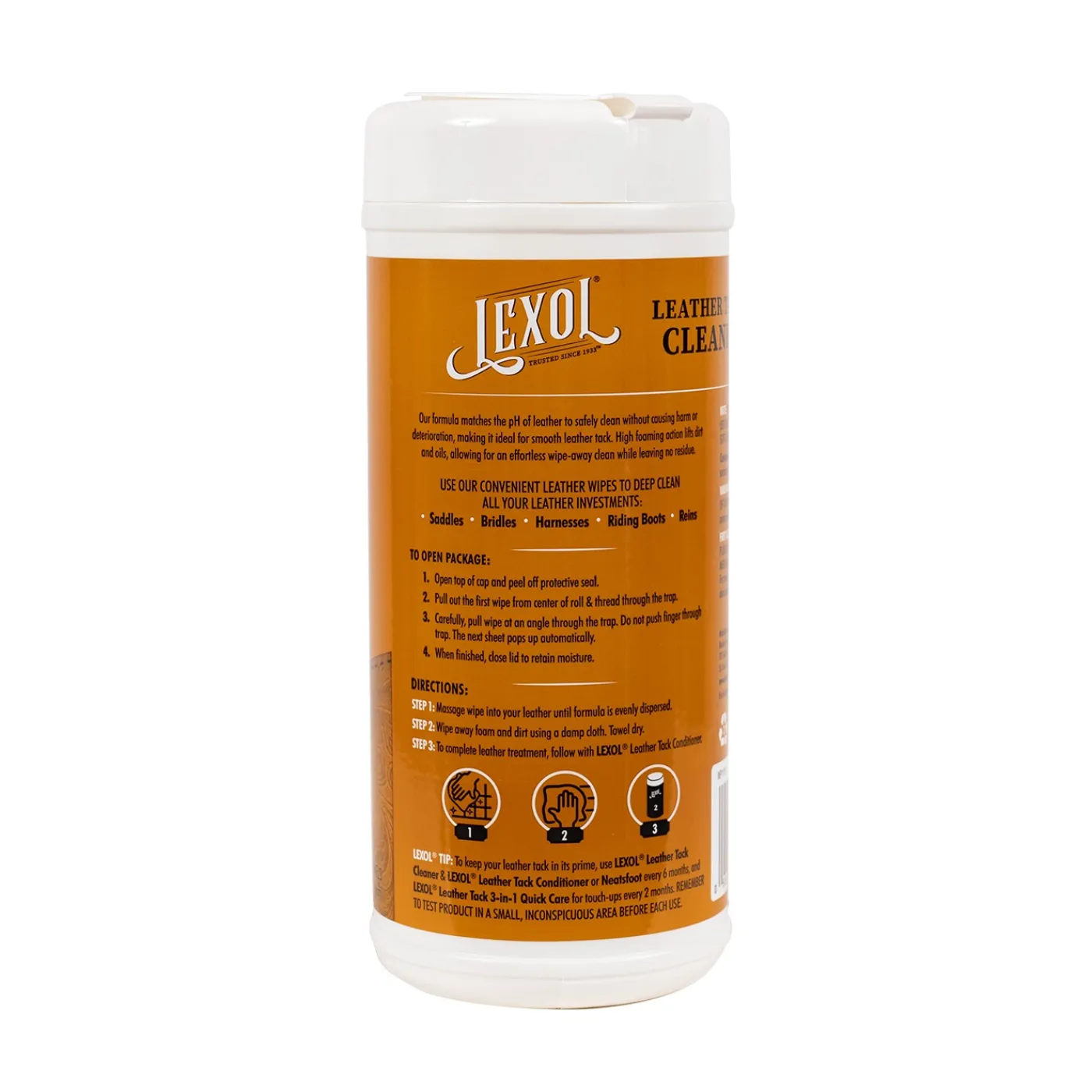 Pre-soaked, pH-balanced leather cleaning wipes, leaves no surface scum or residue. Ideal for smooth leathers, including saddles, boots, bridles and more! Great for daily cleaning, shows, and travel. For best results, use with Lexol® Leather Conditioner Quick Wipes. 25 wipes.